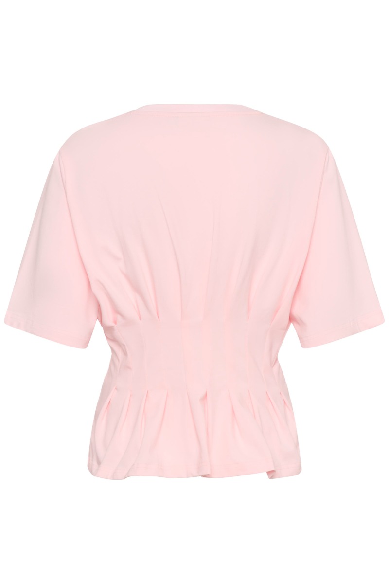 Smuk T-shirt fra Gestuz i en sart lyserød farve. Denne t-shirt har et enkelt men flot design! Den går ind i taljen som går at man for en flot figur! Det er sådan en som bare går til alt i garderoben.