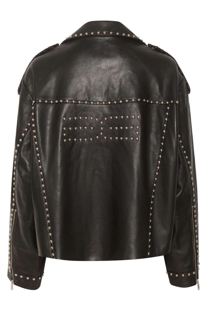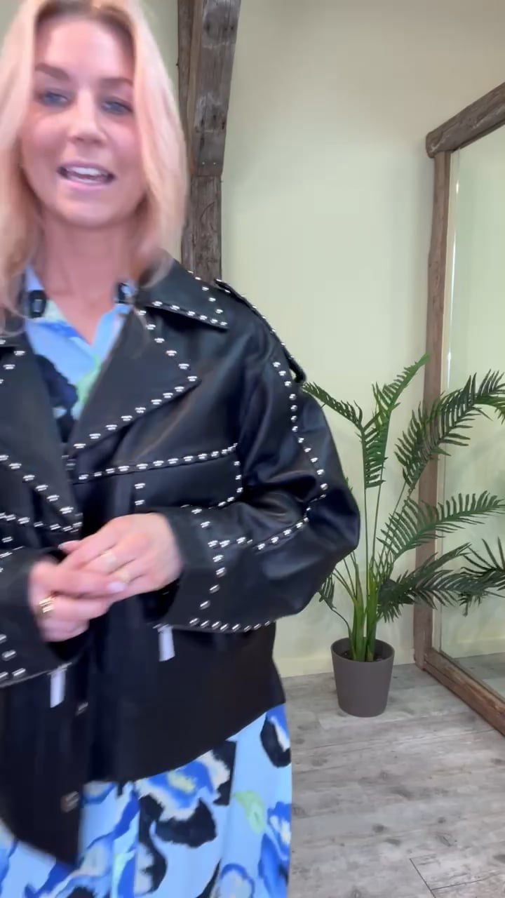 WAAAUW, Se lige den sejeste læderjakke fra Gestuz! Denne læderjakke er helt unik med sølvnitter på samt gestuz eget logo bag på ryggen! Den er med sølv trykknapper og lommer på brystet. Der er kravedetalje samt en sej stropdetalje på skulderen, som gør den ekstra rå! Derudover er den "skåret" over i bunden, hvilket giver den et super cool og råt look. Jakken er oversize i pasformen, men vi anbefaler at vælge den størrelse som du plejer for at få det helt rigtige look.