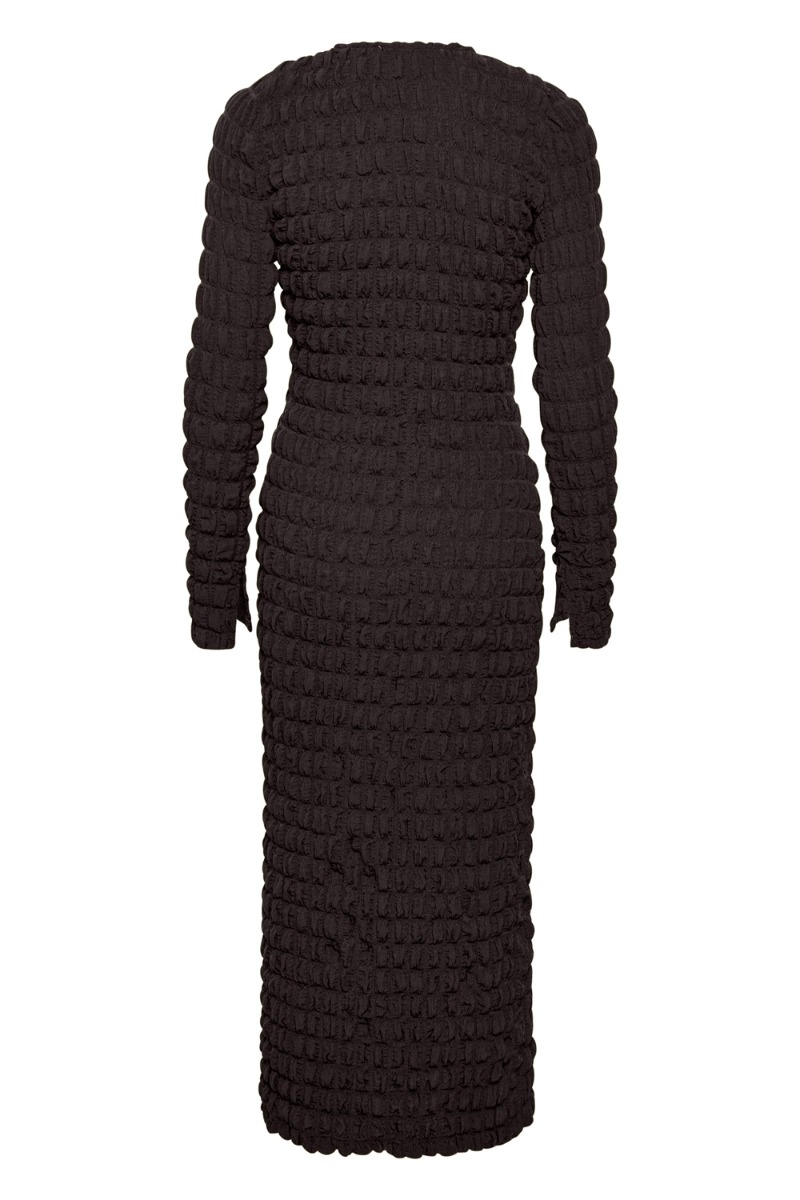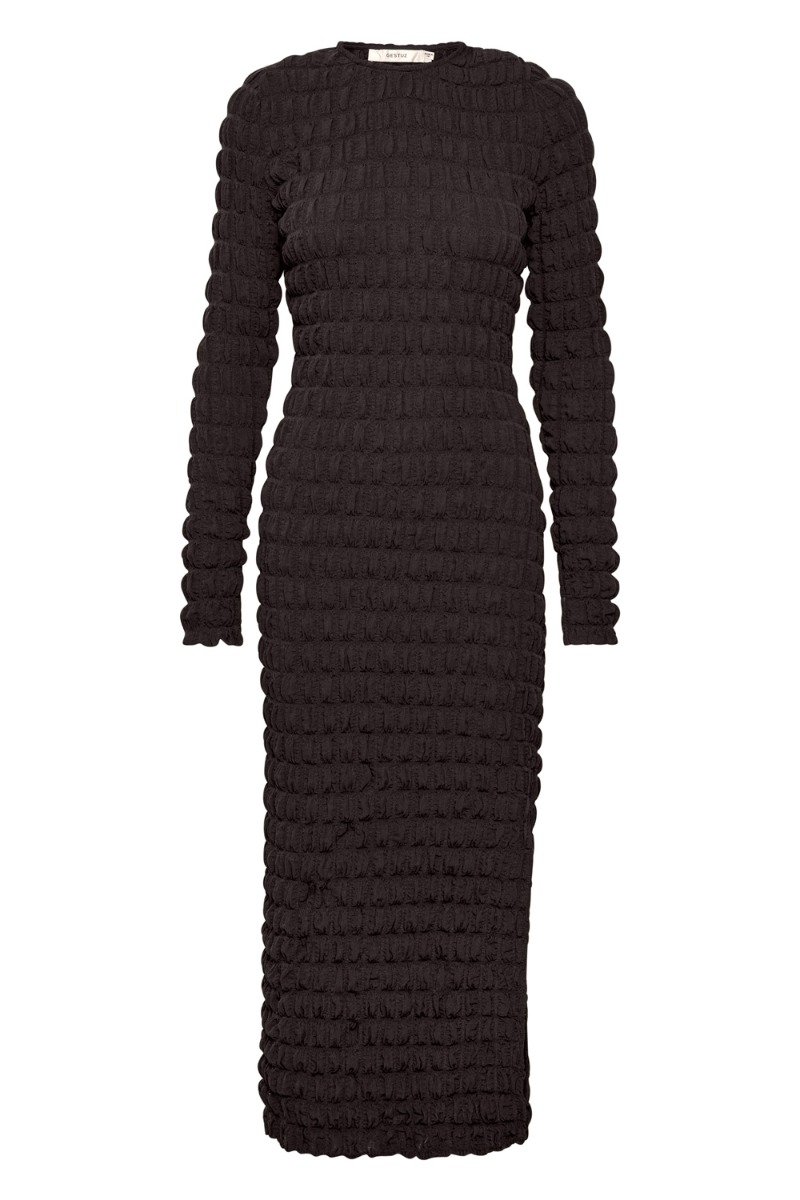 En kjole fra Gestuz vi allerede på forhånd ved bliver en af vores egne favoritter! Kjolen sidder nemlig helt fantastisk på kroppen i det flotte unikke rynkemønster. Den er tætsiddende med stretch i en lang model med slids i bunden. Kjolen har en lille skjult lynlåsdetalje ved skulderen samt skulderpuder der er med til at skabe et cool udtryk til den enkle model. En kjole der både kan styles op og ned efter anledning.