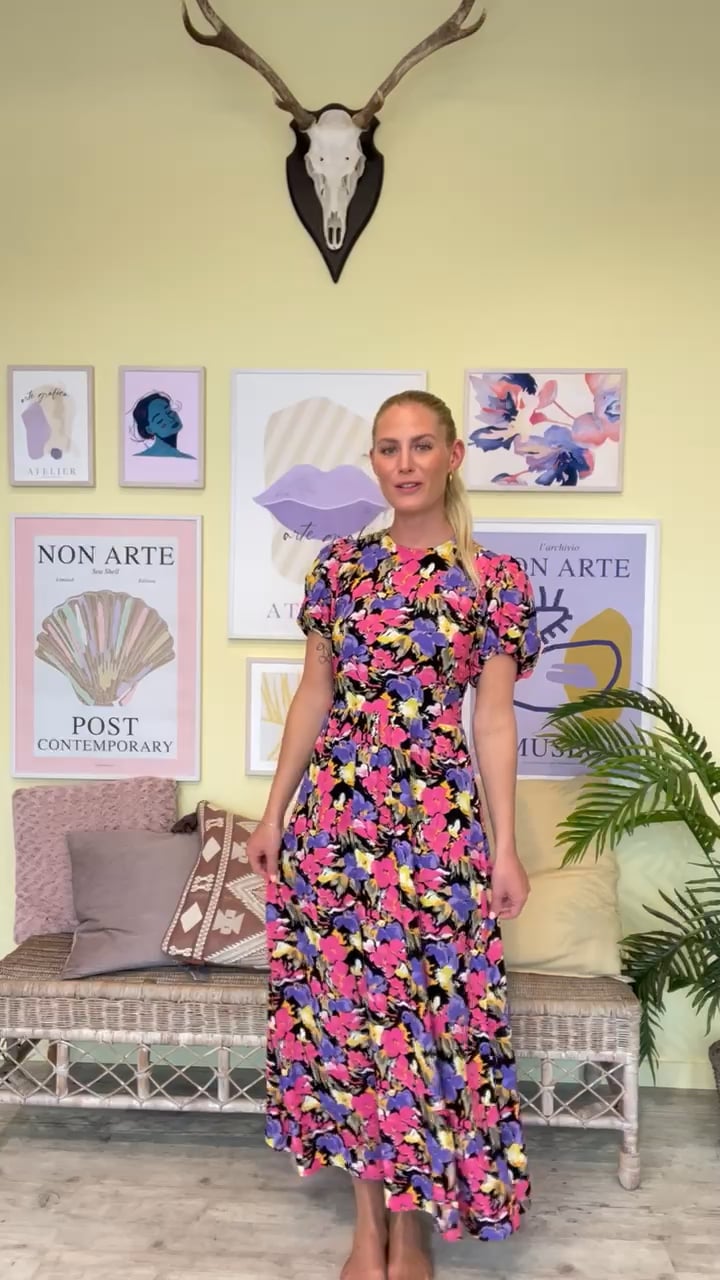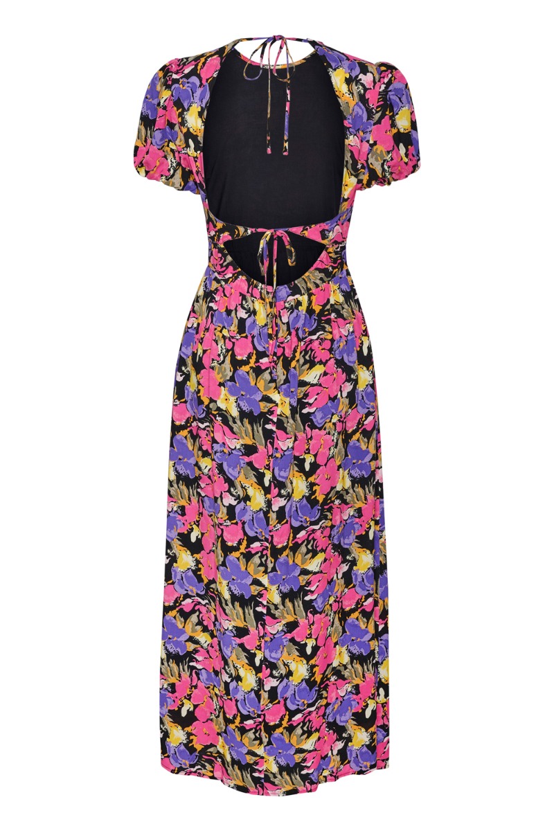 OKAY PIGER!! tjek lige den smukkeste sommerkjole fra Gestuz der er landet! Bundfarven er sort med det skønneste blomsterprint i pink, lilla og orange nuancer. Kjolen har den fineste pasform. Kjolen har en feminin pasform med åben ryg der bindes i nakken og bagtil der giver en utrolig fin detalje til kjolen. Style den med en stilet eller sandal alt efter anledning.