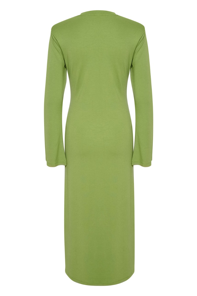 Enkel lang grøn kjole fra Gestuz med huldetalje ved halsen. Kjolen er lettere tætsiddende og går ud i et lille løst a-snit. Den er designet i en blød kvalitet med stretch, lange ærmer og rund halsudskæring. Kjolen har skulderpuder der nemt kan tages ud med velcro. Style den med en støvle eller stilet alt efter anledning.