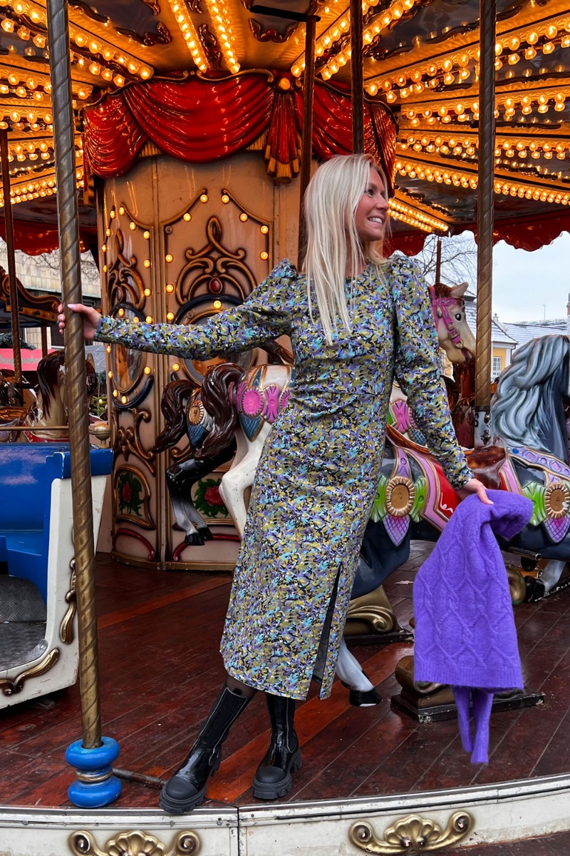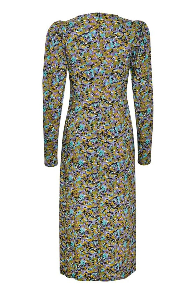 Smuk lang kjole fra Gestuz i et flot multifarvet blomsterprint. Kjolen har en tydelig syning i taljen som giver en flot figur. Derudover er den designet med slids foran som der sidder en lynlås i og derfor kan slidsen justeres efter eget ønske. Den er designet med lange ærmer og rund halsudskæring. Kjolen er designet i et utrolig strækbart materiale som gør den fantastisk at have på!