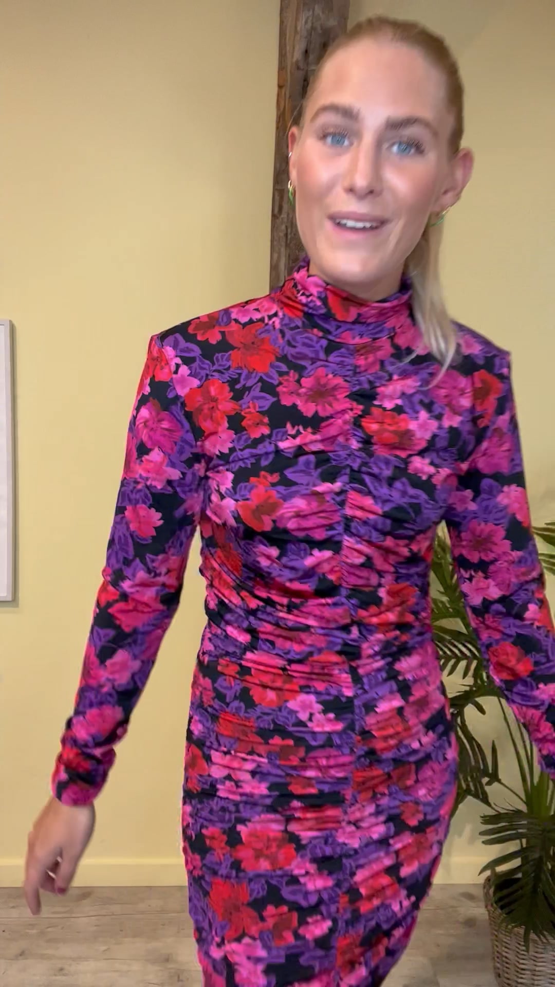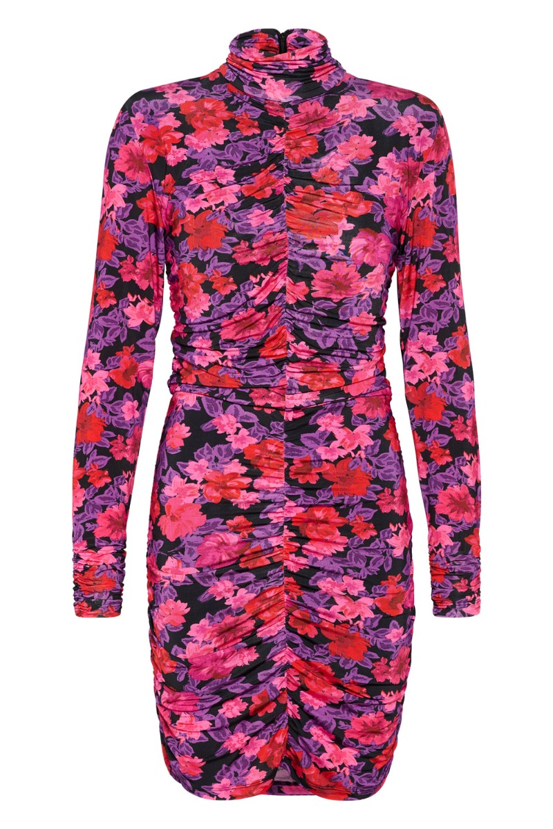 Endnnu en smuk kjole er kommet fra Gestuz. Den er i et blomsterprint i lilla og pink farve. Den har draperinger ned langs siden og falder så flot på kroppen. Den lukkes i nakken med en skjult lynlås og har skulderpuder samt lange stramme ærmer. Den findes i flere modeller og en rigtig julefrokost kjole.