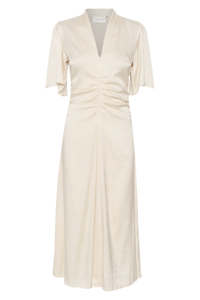 En utrolig SMUK kjole fra Gestuz der er oplagt til de kommende forårsfester og arrangementer. Kjolen falder så flot i det fineste snit der går ind i taljen og falder langs kroppen med rynkeeffekt ved barmen. Den har en smuk enkel lys nuance med diskret mønster i stoffet. Style denne kjole til en stilet eller støvle alt efter hvilket udtryk du ønsker.