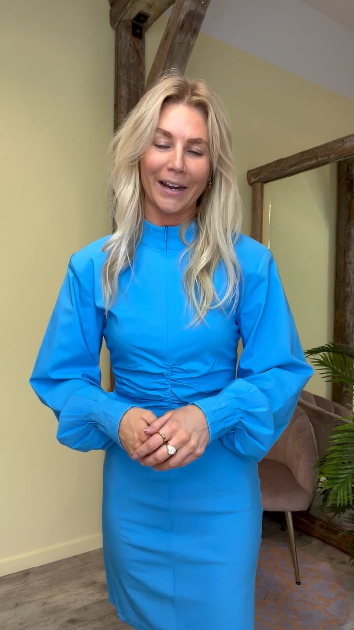 WAUW.. Denne kjole fra Gestuz er en kjole der virkelig skal prøves på! Den sidder spot-on i den tætsiddende pasform med stretch og rynkedetalje foran. Kjolen er i et lækkert behageligt materiale med en lang ziplynlås foran og lange ærmer der afsluttes med en fin "læg" detalje ved håndleddet. Den har skulderpuder der nemt kan ries op hvis ikke du ønsker dette.