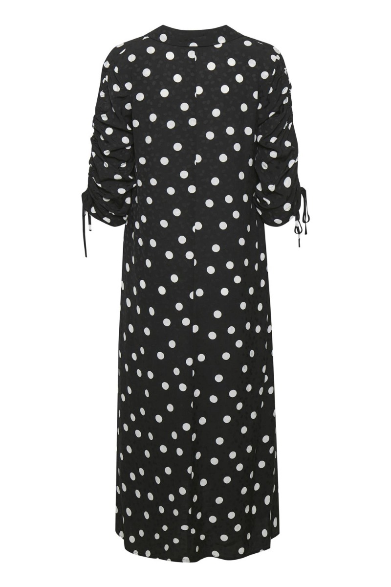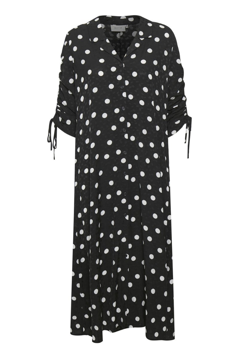 Sort lang kjole fra Gestuz med hvide prikker i et let behageligt materiale. Man kan virkelig se at der er blevet kredset om detaljerne ved denne kjole. Den har skjortekrave foran der går ned i v-udskæring og lukkes med knapper hele vejen ned. Ærmerne har snøre der kan justeres og skabe en sød rynkedetalje med en lille skulderpude. Kjolen har medfølgende bælte til at skabe et feminint look og kan samtidig styles helt løs afslappet med en sneaks. Den er "prikken over i'et".