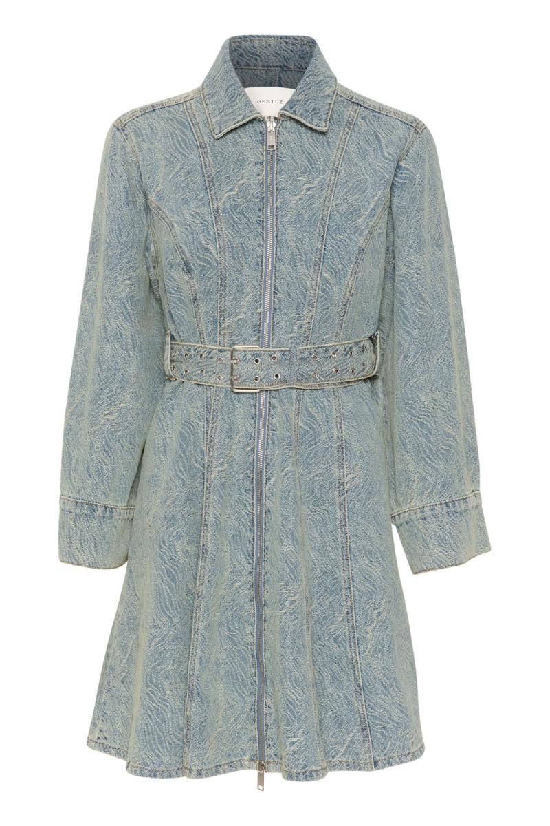 Den fineste denim kjole fra Gestuz i et sødt snit der gør den både er feminin og cool. Kjolen har a-snit og har medfølgende bælte til der giver en rå detalje. Den lukkes foran med lynlås hele vejen ned og kan samtidig lynes op nede fra for at skabe en lille slids. Kjolen har et sejt diskret mønster i stoffet og brede ærmer. Style den både op og ned alt efter anledning.