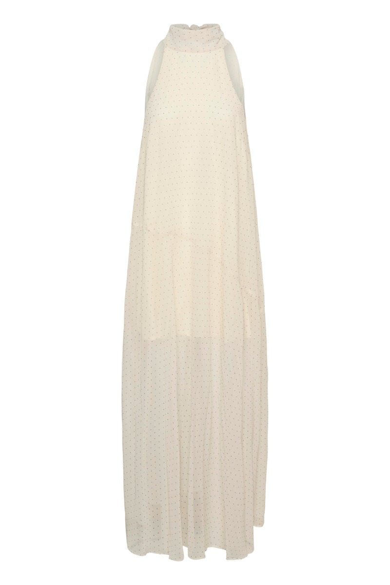 Smuk og elegant kjole fra Gestuz! Denne kjole har en smukt feminint design med helt små sorte prikker, derudover er den gulvlang og med et bindebånd i nakken. Den er oplagt til sæsonens fester og kan let bruges til et par stilleter eller sandaler!