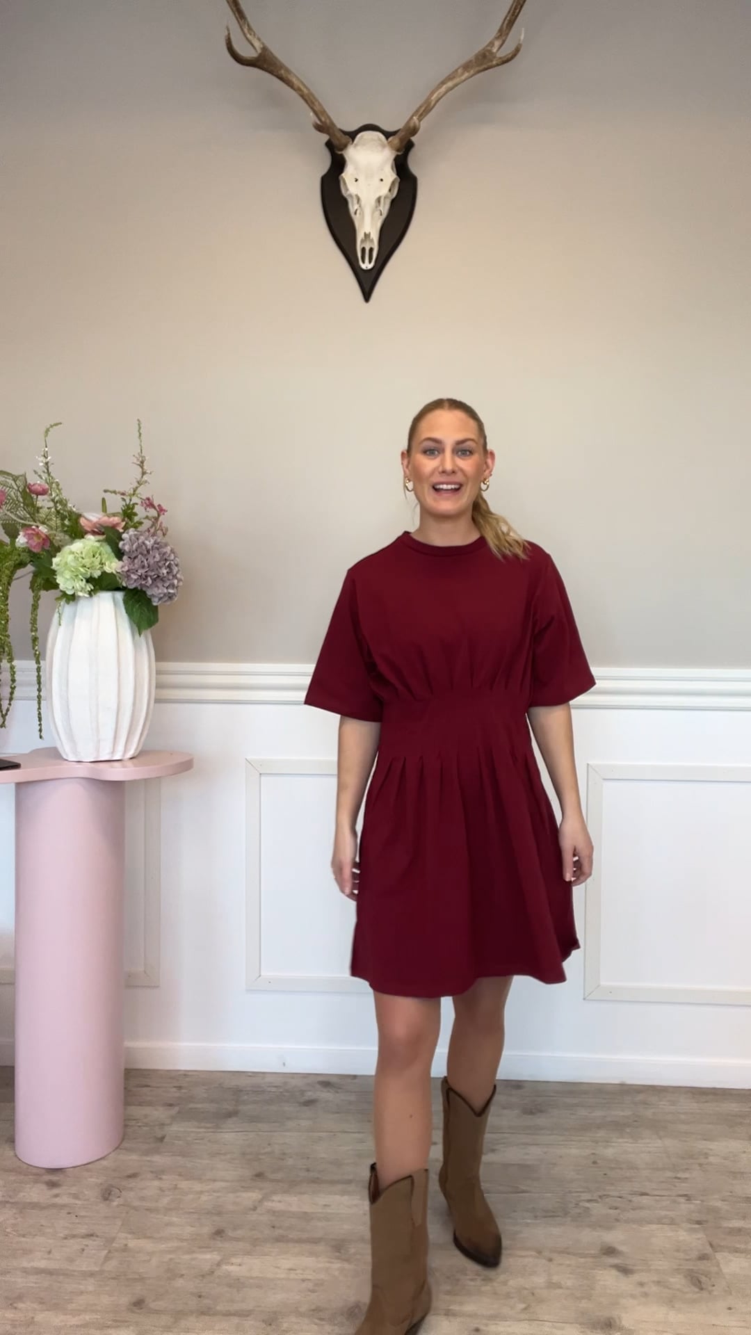 Kjolen er designet i en dyb bordeauxrød farve og har et enkelt, moderne udtryk med fine, feminine detaljer. Den har en rund halsudskæring og korte, let rummelige ærmer, som giver et afslappet og behageligt fald. Taljen er markeret med diskrete læg og syninger, der skaber form og struktur uden at virke stram, og som giver kjolen en flatterende silhuet. Materialet fremstår blødt og glat med en let stretch, hvilket sikrer god komfort og bevægelsesfrihed. En alsidig kjole, der nemt kan styles både til hverdag og til mere formelle anledninger.