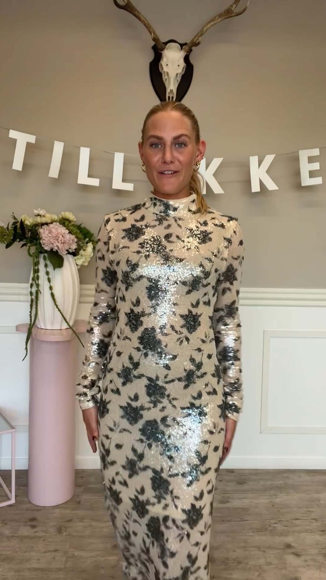 En smuk kjole i denne chapagne farve med blomsterprint i dette shine look fra Gestuz. Den er tætsiddende og har høj hals samt en dyb ryg. Derudover er den med slids bagpå til så den er nem at bevæge sig i. Perfekt til denne sæsons fester.