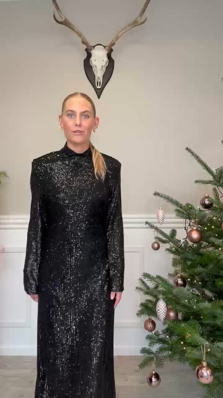 Smuk og festlig kjole fra Gestuz. Denne kjole er super elegant med sit palliet design i sort! Kjolen har lange ærmer og lukkes i nakken med lynlås. Brug den evt. til jolefrokoster, juleaften, nytår eller andre særlige begivenheder.