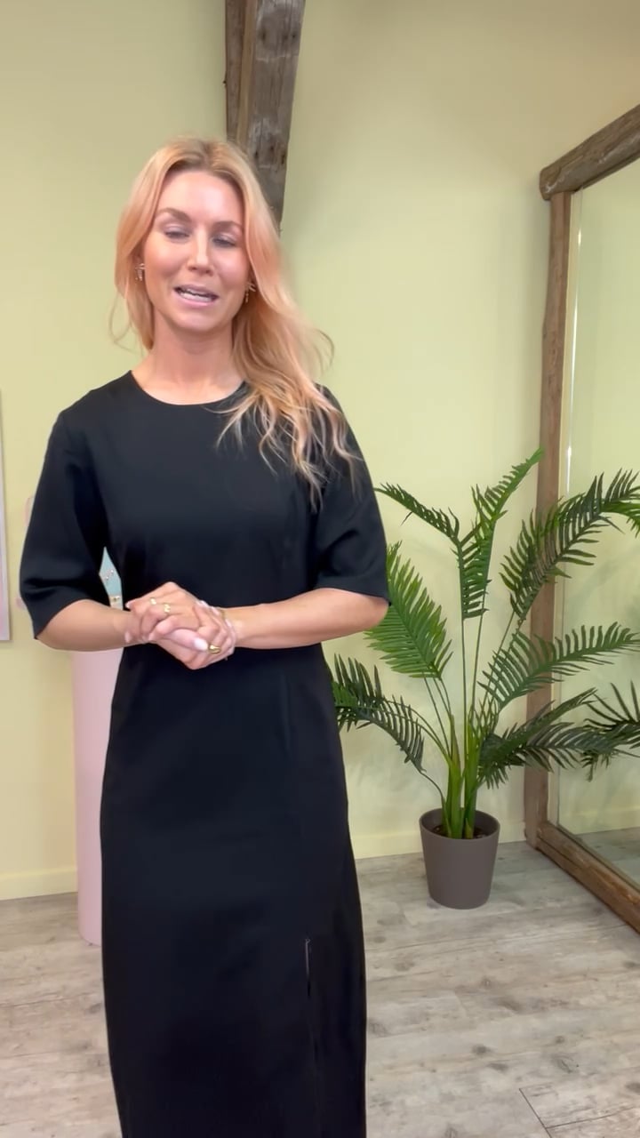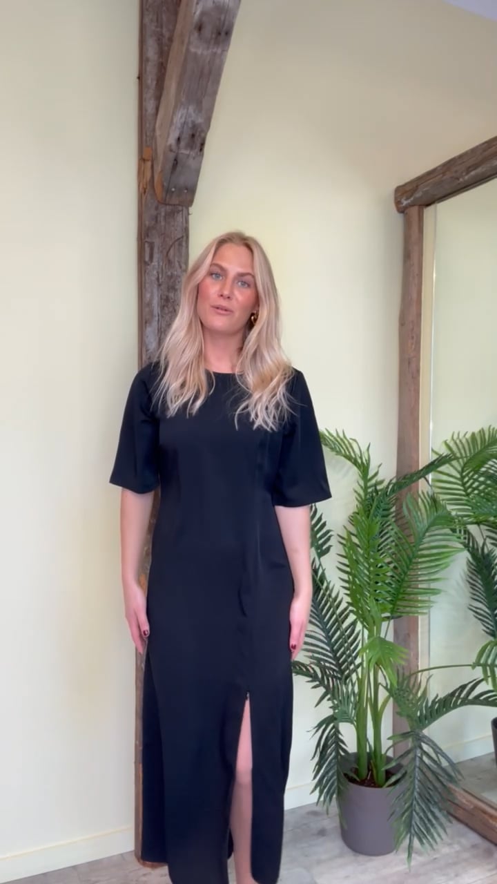Denne model kender vi fra Gestuz og vi elsker den. det er den kendte Melba kjole model, som er i den lækreste og kraftige kvalitet. Derudover er den med rund halsudskæring og gar korte ærmer der ikke er helt tætsiddende. Der er en skjult lynlås i bunden som kan lynes op til en slids, og til den længde man ønsker.