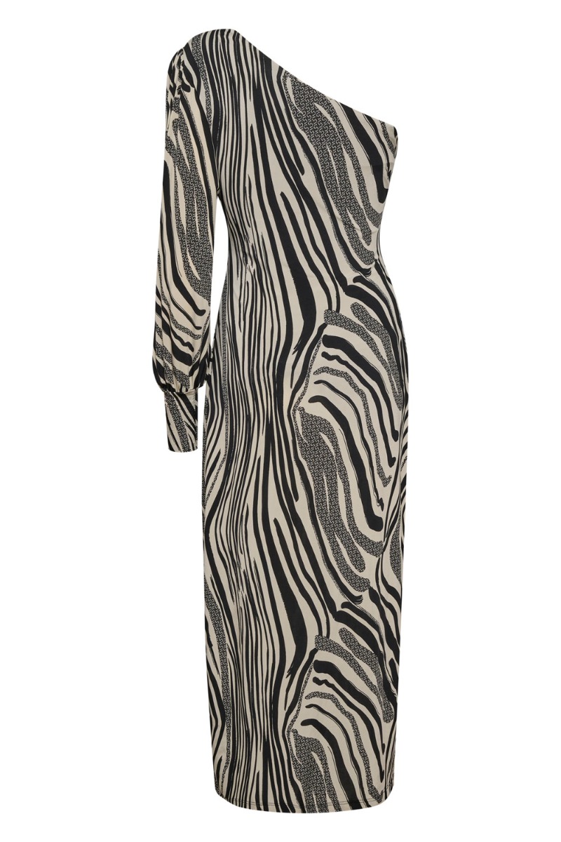 Gestuz har lavet denne kjole i en blød kvalitet med masser af stræk i et sort og hvidt mønster. Kjolen er med one shoulder og skulderpude i den ene side. Derudover er den lang med en slids i den ene side. Der er et ballonærme og en detalje i taljen. Kjolen findes også i et leo print.
