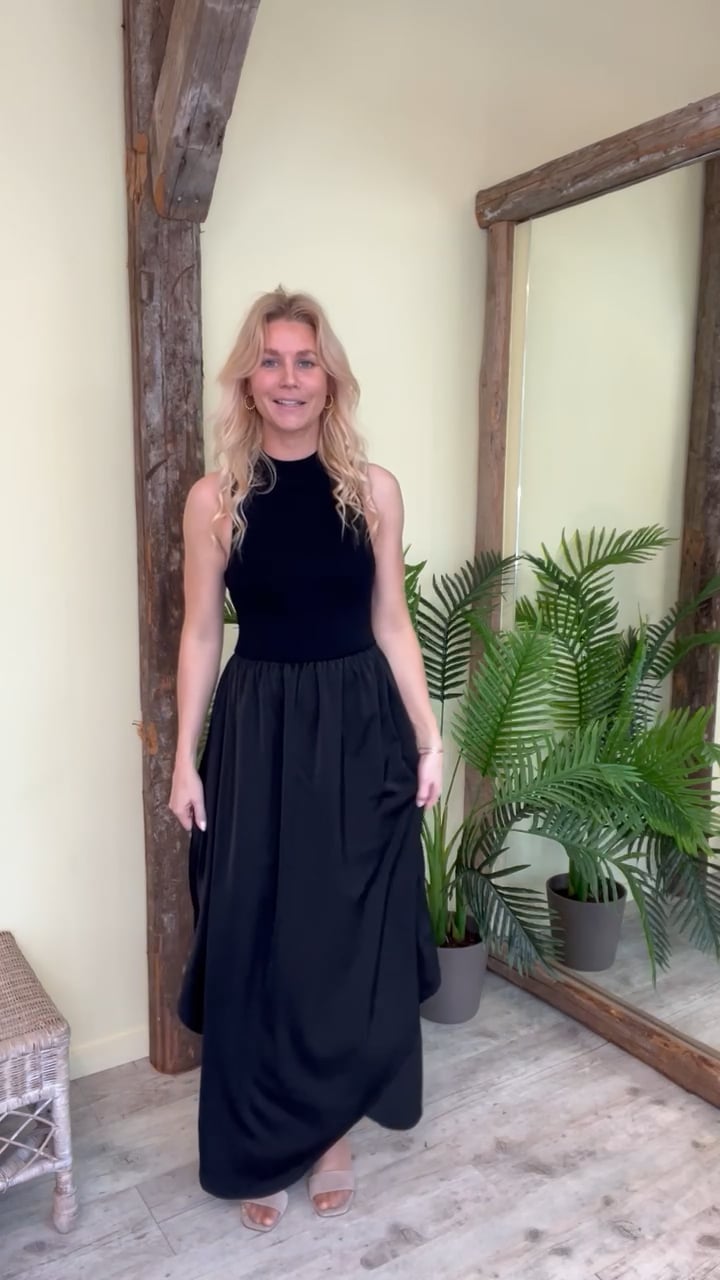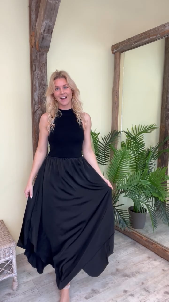 Waaauw, den SMUKKESTE enkle sorte kjole fra Gestuz der er oplagt til de mange kommende fester. Kjolen sidder til ved barmen og falder løst i et fint materiale der går længere ned i siden og giver et flot slæb. Kjolen er utrolig behagelig at have på og er med stretch i den øverste del. Style den med en stilet eller rå støvle alt efter hvilket look du ønsker.