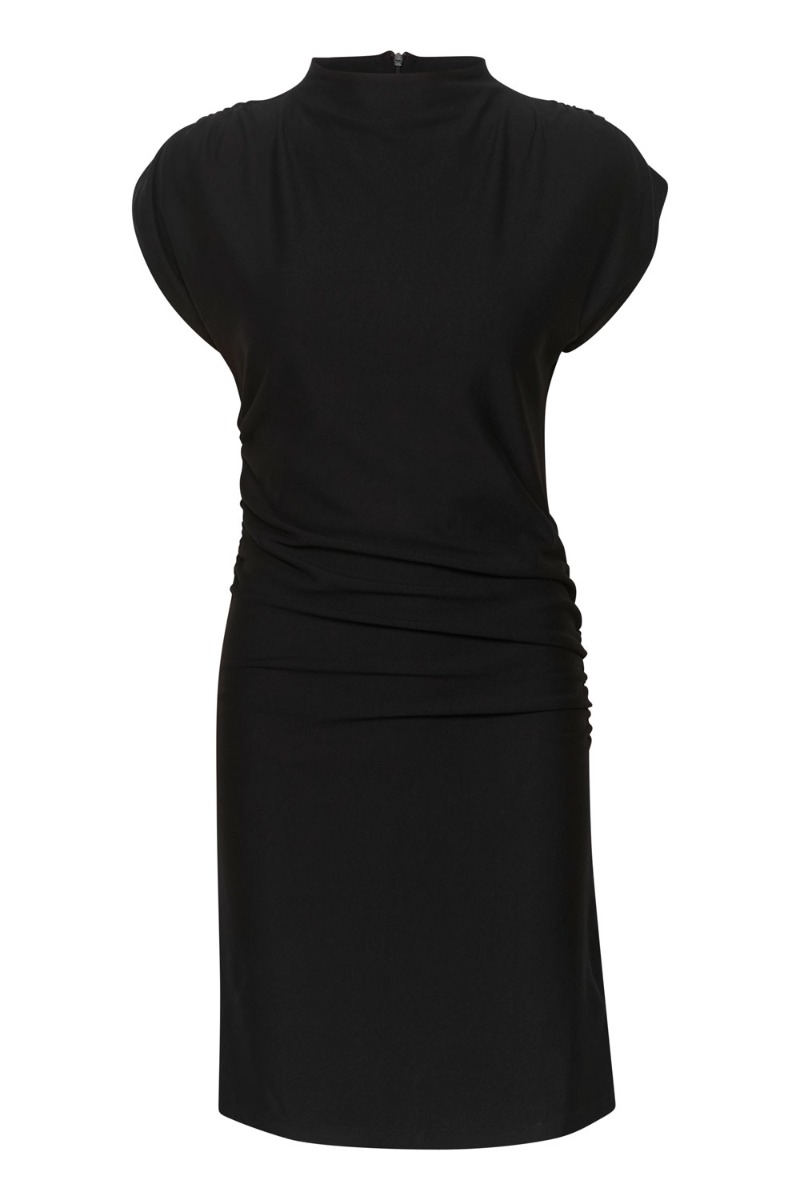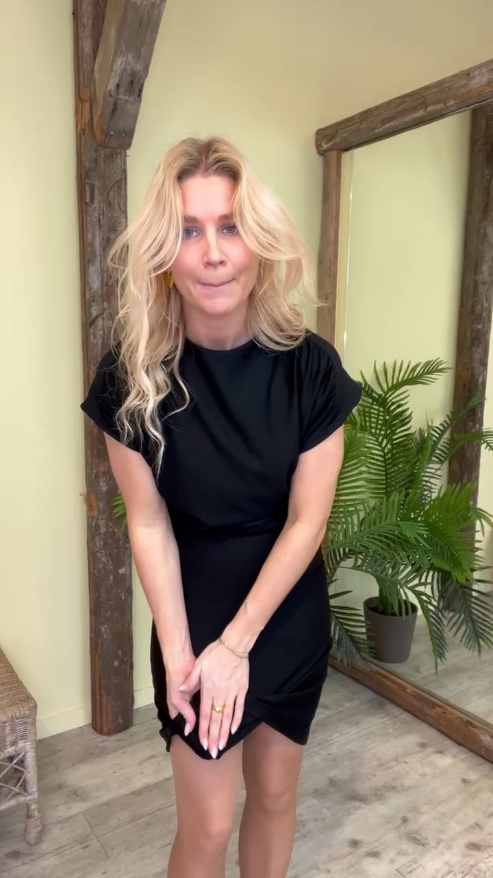 Endnu en fin rifa kjole model fra Gestuz er kommet. Den er kommet i sort og er med korte ærmer. Der er sat en rynkedetalje i begge sider som gør at den er tætsiddende men uden at stramme. Der er lynlås bagpå som er skjult og derfor får den et klassisk look. Den er nem til hverdag med en strik eller til fest med stiletter.