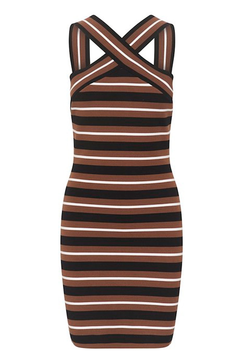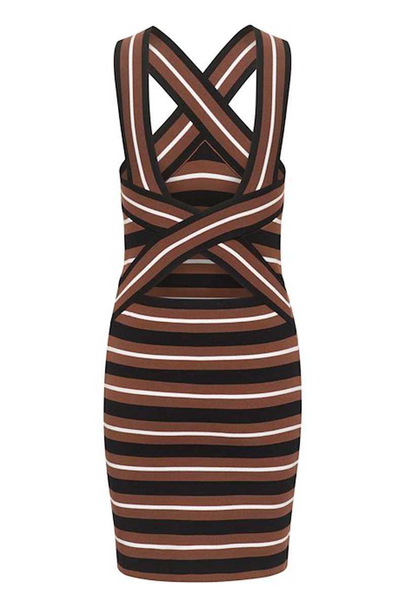 En super smuk kjole fra Gestuz er kommet med stiber i brune nuancer. Den er tætsiddende men i en kvalitet der er med masser af stræk og derfor strammer den ikke. Den har halterneck effekt og har en lille hul detalje ved ryggen. Den er fin til fest med et par stiletter.