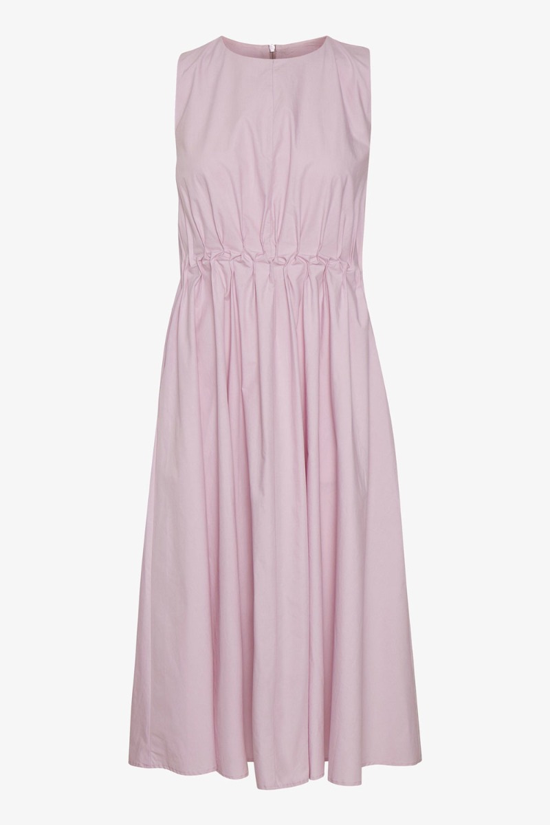 Fineste kjole fra Gestuz i lyserød med rynkedetalje ved livet der giver en feminin talje og sød to-delt-effekt. Kjolen har et fint lille a-snit i et kraftigt materiale og lukkes på ryggen med lynlås ved den runde halsudskæring. Brug kjolen med en sød sandal eller stilet.