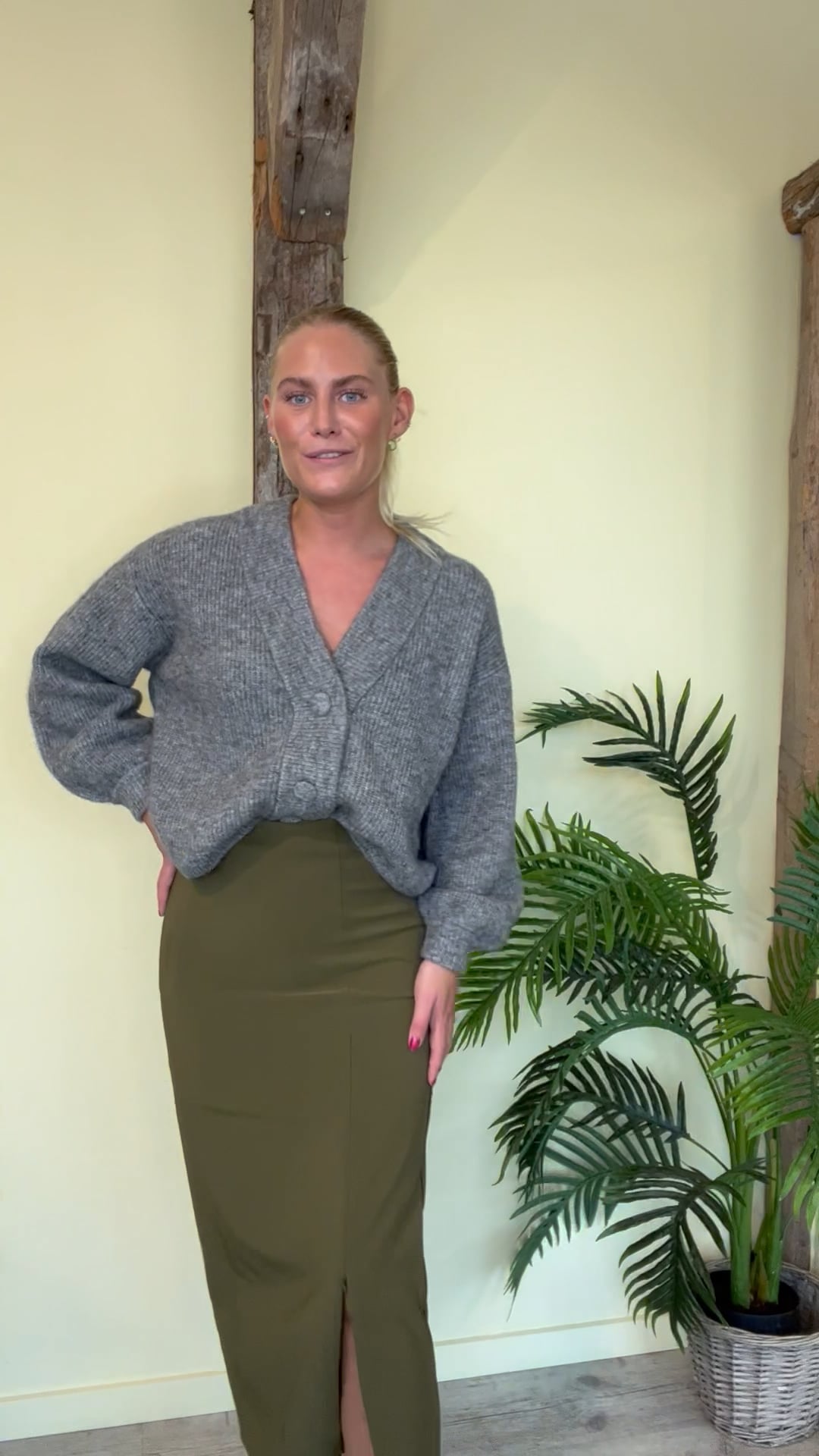 En vanvittig smuk nederdel fra Gestuz er kommet i en army grøn farve. Nederdelen er med en lynlås skråt til den ene side, den kan nemlig lynes op og danne en slids. Derudover er kvaliteten kraftig og der elastik i taljen. Nederdelen findes også i sort og kan bruges både til en fin skjorte eller en basis t-shirt.