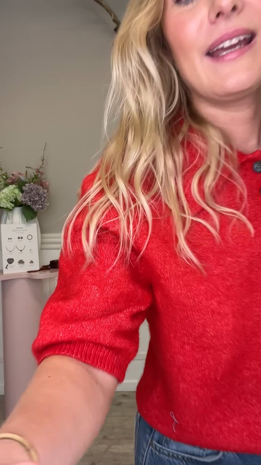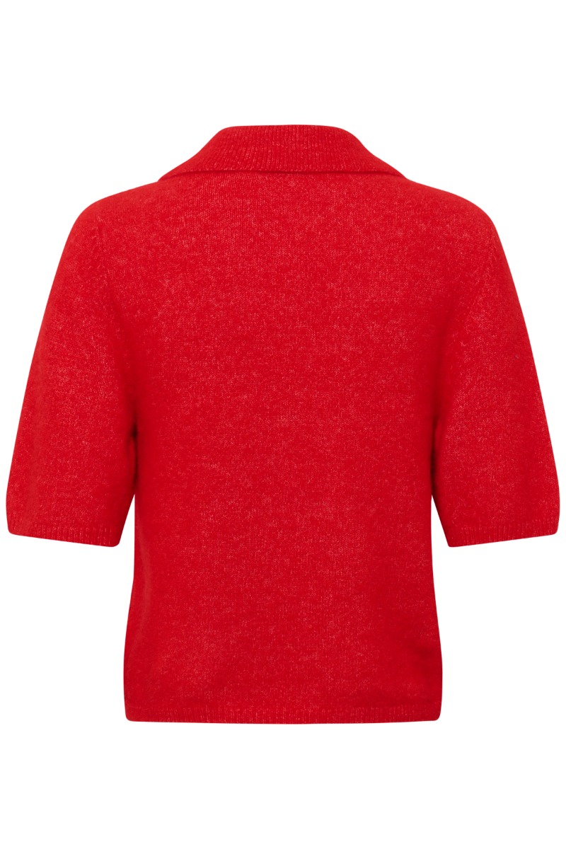 Toppen er en kortærmet strikbluse i en klar, rød farve med et klassisk og feminint udtryk. Den er designet med en blød polokrave og en kort knaplukning foran med små, diskrete knapper, som giver et elegant og let retroinspireret look. Materialet fremstår fintstrikket og let meleret, hvilket tilfører dybde og en behagelig, blød struktur. Pasformen er lige og en smule løs, så den falder flot uden at sidde stramt. En stilfuld top, der fungerer lige så godt til hverdag som til mere velklædte anledninger, både med bukser og nederdel.