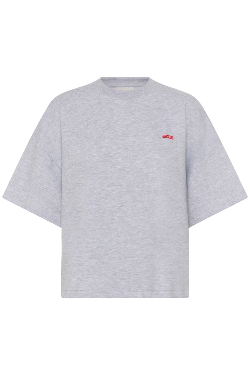 Enkel og cool T-shirt i en lys grå meleret farve med et minimalistisk udtryk. Modellen har en afslappet, boxy pasform med korte, brede ærmer og rund hals, som giver et moderne og casual look. Det lille røde broderede logo på brystet tilfører et diskret, sporty touch, mens den bløde bomuldskvalitet gør den behagelig at have på hele dagen. Perfekt som en alsidig basisstyle, der nemt kan styles med jeans, nederdele eller under en blazer for et afslappet hverdagsoutfit.