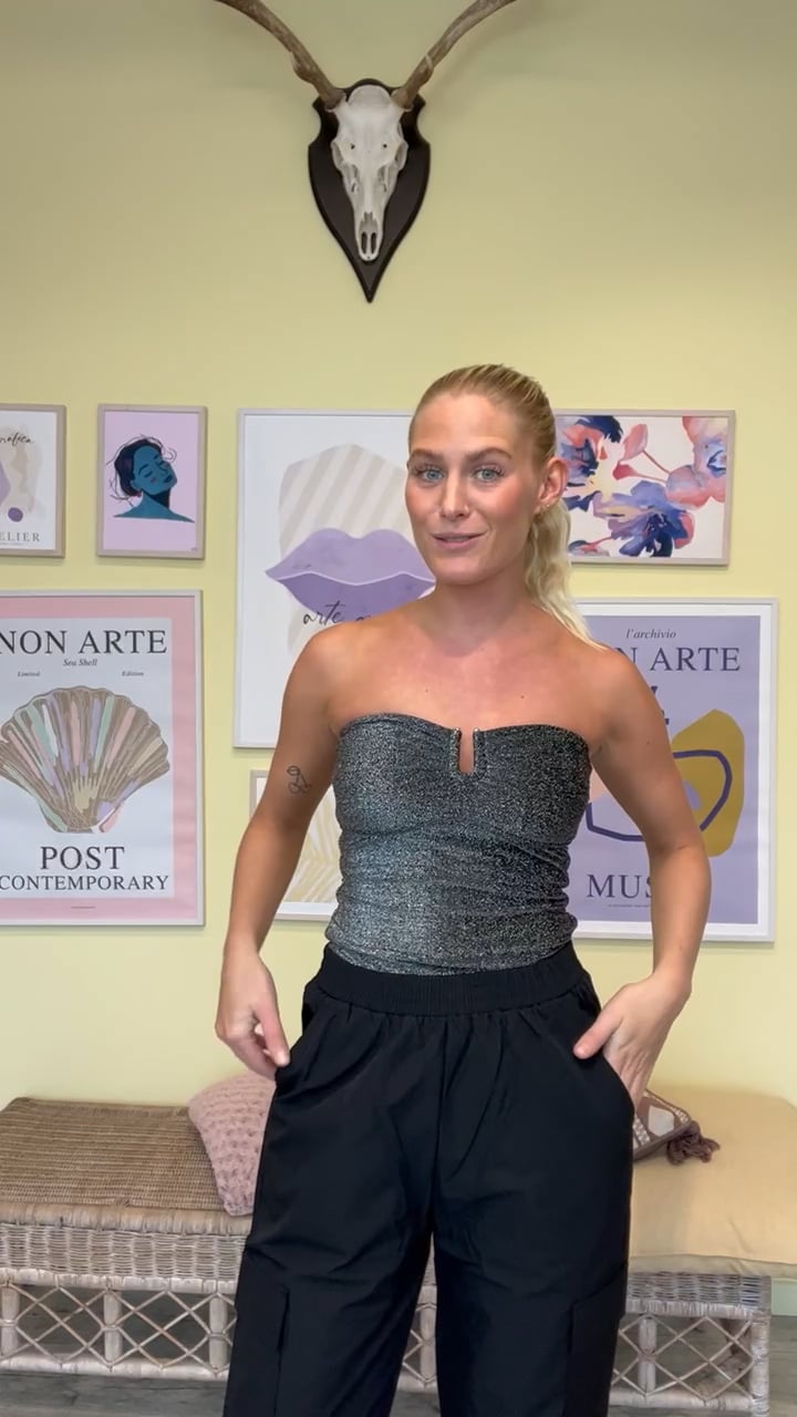 En top man ikke må glemme er denne skønne tube top fra Gestuz fuld af glimmereffekt. Toppen er uden stropper og har en sød lille åbning foran der gør at den bare sidder lige som den skal. Toppen er tætsiddende i en strækbart materiale og super smuk med sorte bukser eller nederdel til de kommende julefrokoster.