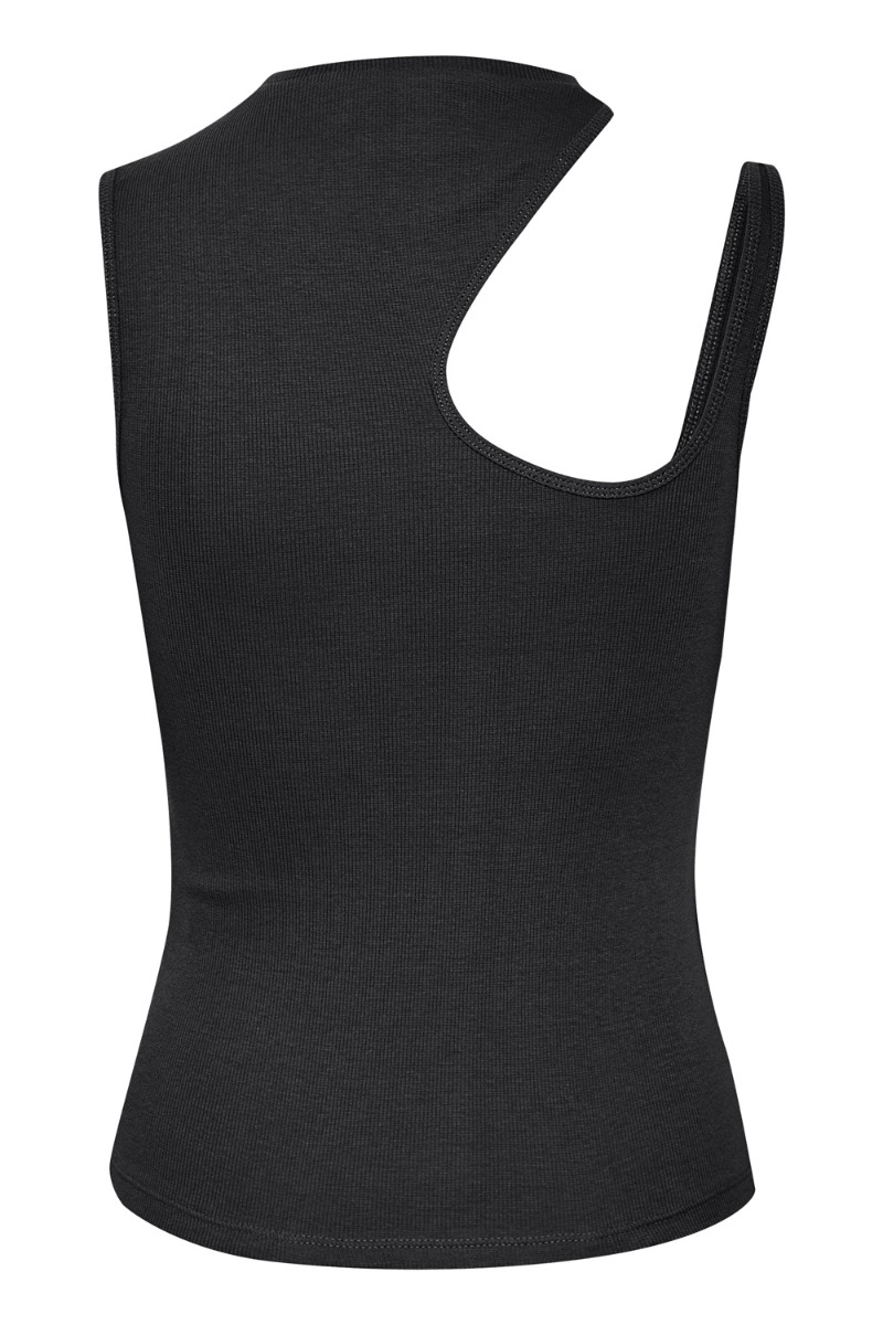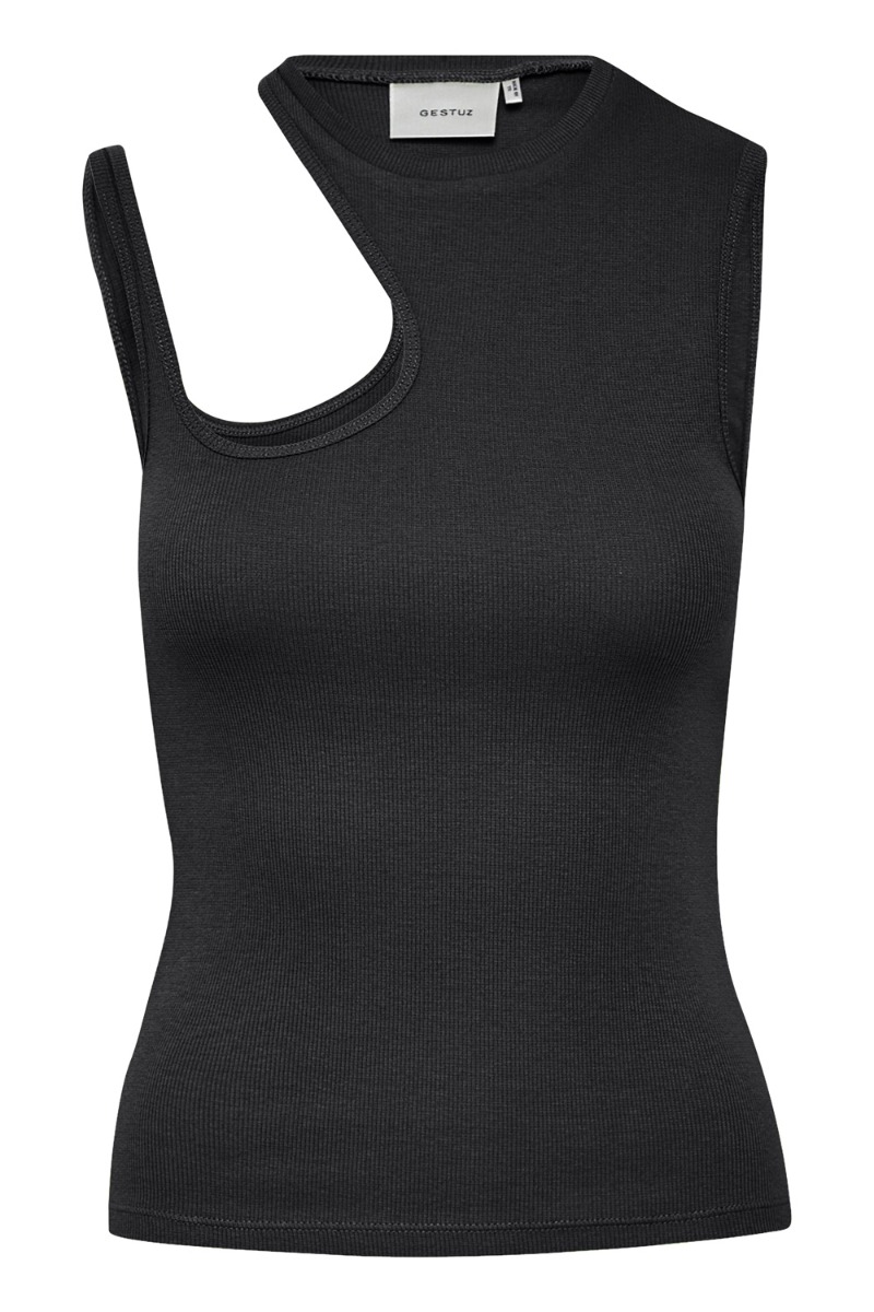 Den sejeste top fra gestuz i sort. Sort kan man altid bruges og tages med ind i flere sæsoner. Snittet på toppen er det her moderne asymmetriske hul i den ene side som holdes oppe med en strop i samme side. Brug den gerne sammen med en par rå denim shorts.