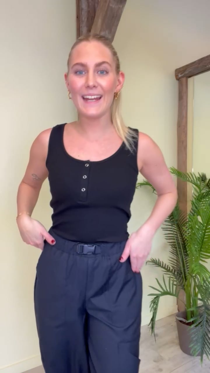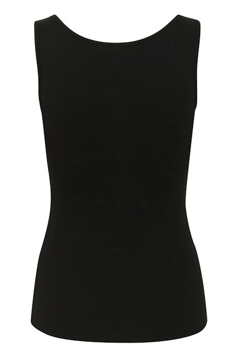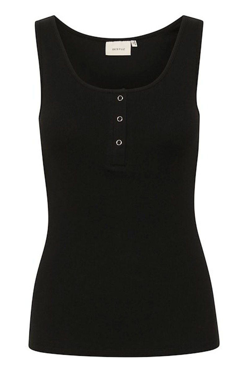 En fin basis top til garderoben i sort rib kvalitet med trykknapdetalje foran. Den er fra Gestuz, og de laver altid tøj i en god kvalitet - det har de også gjort her. Den findes også i hvid og kan bruge til at have under en blazer og sættes til hvilken som helst underdel.