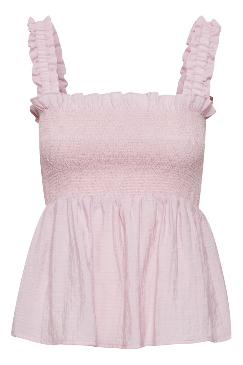Lyserød singelt top fra Gestuz i vores yndlings rosa nuance. Toppen har smockdetalje ved barmen der giver en peplumeffekt i bunden og de sødeste flæsestropper. Vi er helt klar til at hoppe i denne skønne sag med et par denim jeans eller shorts til sommeren.