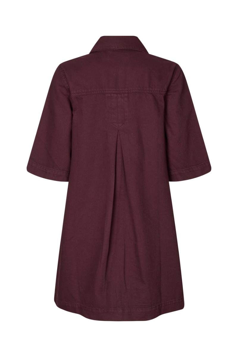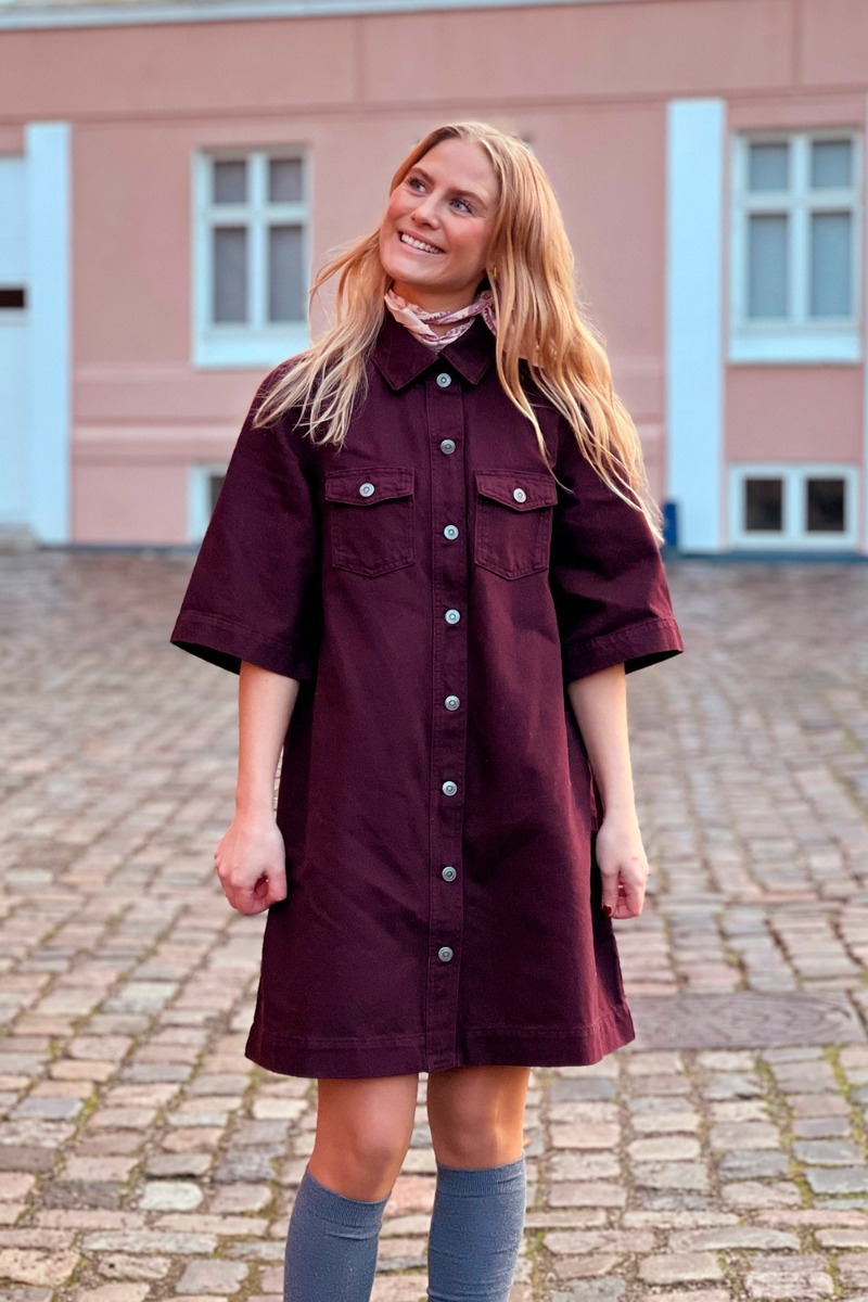 Her skal du altså være hurtig! Denne denim kjole bliver et HIT denne sæson! Den smukke bordeaux farve er super populær til denne sæson! Denim kjoler er altid geniale både til fest og hverdagsbrug. Den har et fint a-snit med knapper hele vejen ned og korte t-shirtærmer. Kjolen har en blød kvalitet der gør den utrolig behagelig at have på.