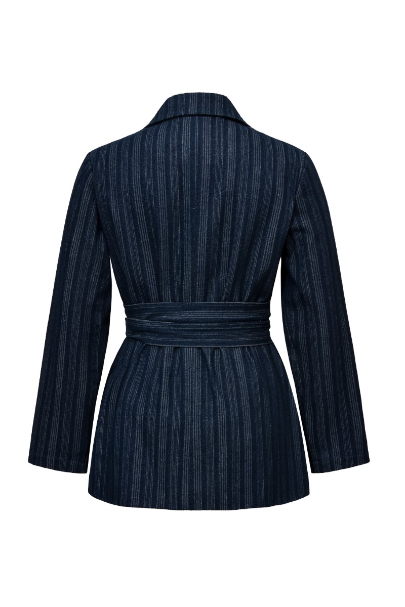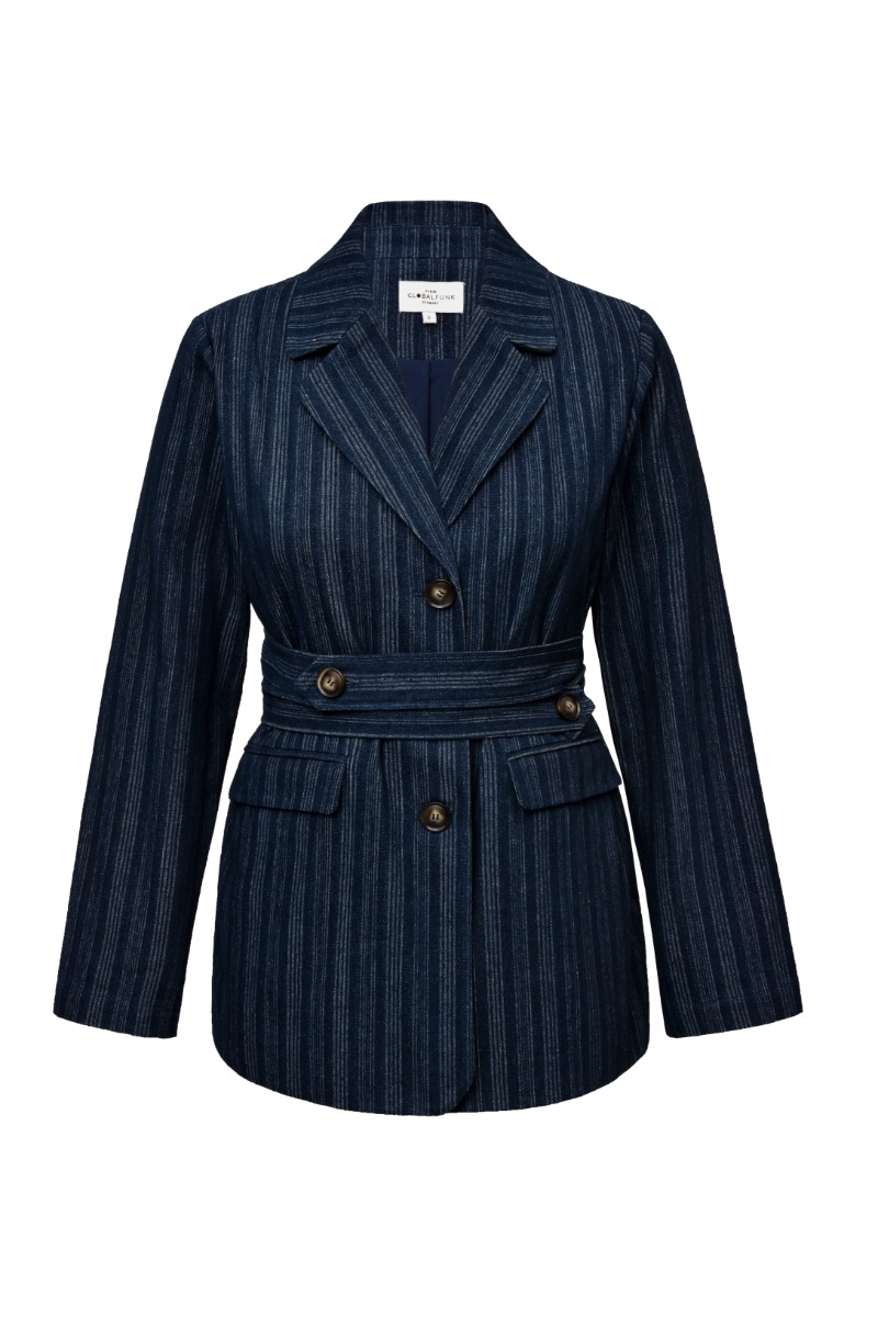 En sej blazer fra Global Funk i en blå farve med striber. Den er i en lækker denim kvalitet og vi må bare sige at Global Funk er altså dem med den flotteste og mest holdbare kvalitet. Der medfølger et bindebånd som du kan bruge til at skabe mere talje til dit outfit. Bindebåndet kan sagtens tages af og blazeren lkan bruges uden.