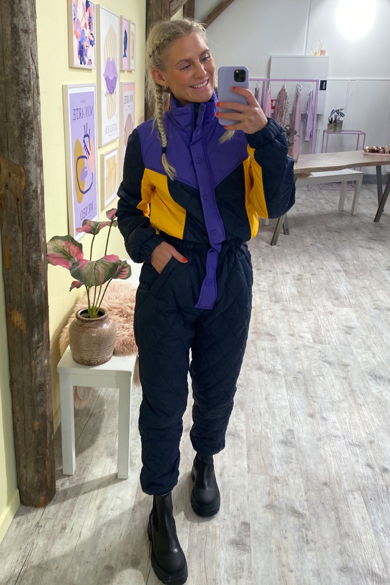OMG hvor er den nye jumpsuit fra Global Funk sej! Den har retro detaljer med lilla og orange farver som bare gør buksedragten SÅ cool. Den lukkes foran med lynlås og knapper og har indvendig snørre så du får den helt perfekte talje. Buksedragten har elastikkant ved håndled og ankel og er foret øverst indvedigt med det blødeste fleece.