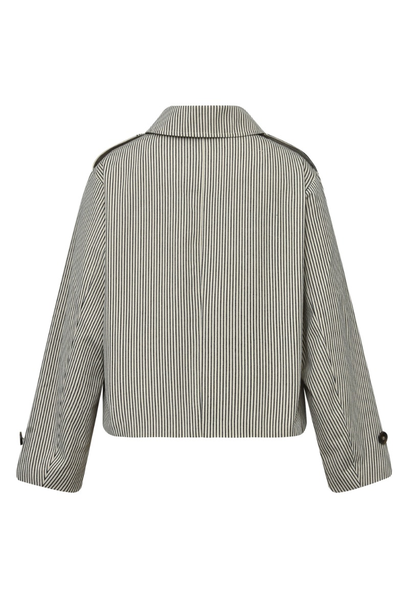 En sød overgangsjakke med striber i lodret retning fra Global Funk kommer til denne sæson. Den er perfekt løs i pasformen så den er nem at bruge med en strik under. Derudover lukkes den foran med knapper og har knapdetaljer ved ærmer og skulder.