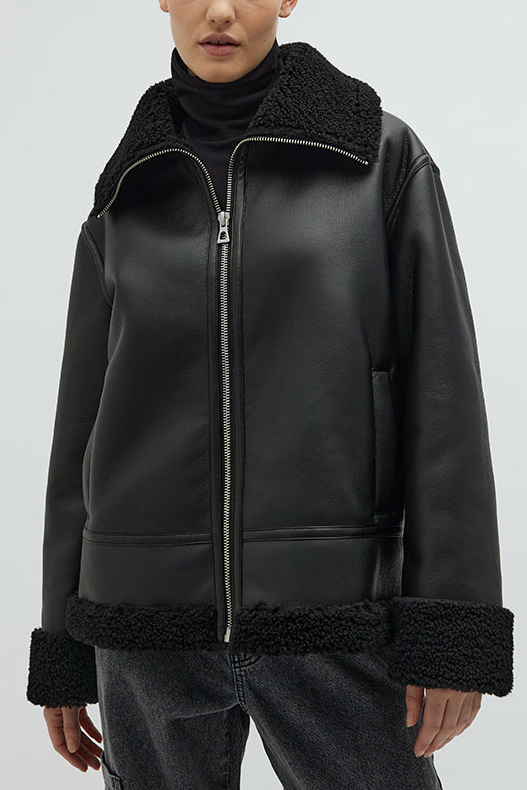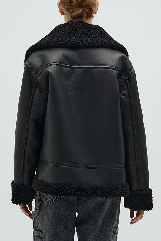 Så venner! Nu er det med at holde fast - for her kommer den sejeste jakke fra Global Funk. Den er med et smukt læderlook og har dette plys for indvendigt. Den er løs i pasformen og derfor også god til at have en strik under, hvis vejret bliver koldere. Den lukkes forna med en lynlås som sidder en smule skævt ift midten. Den er god til at give dette rå look.
