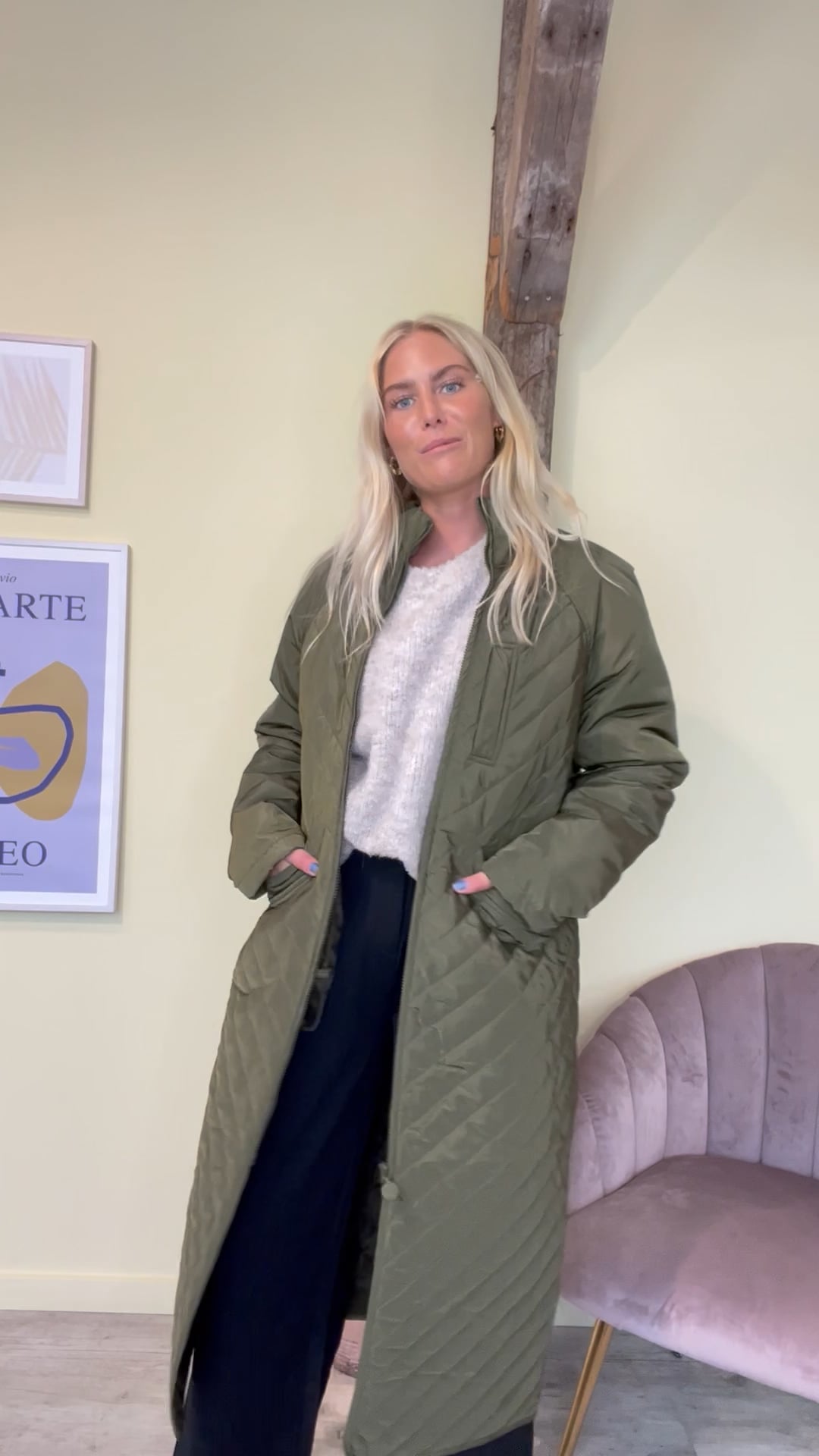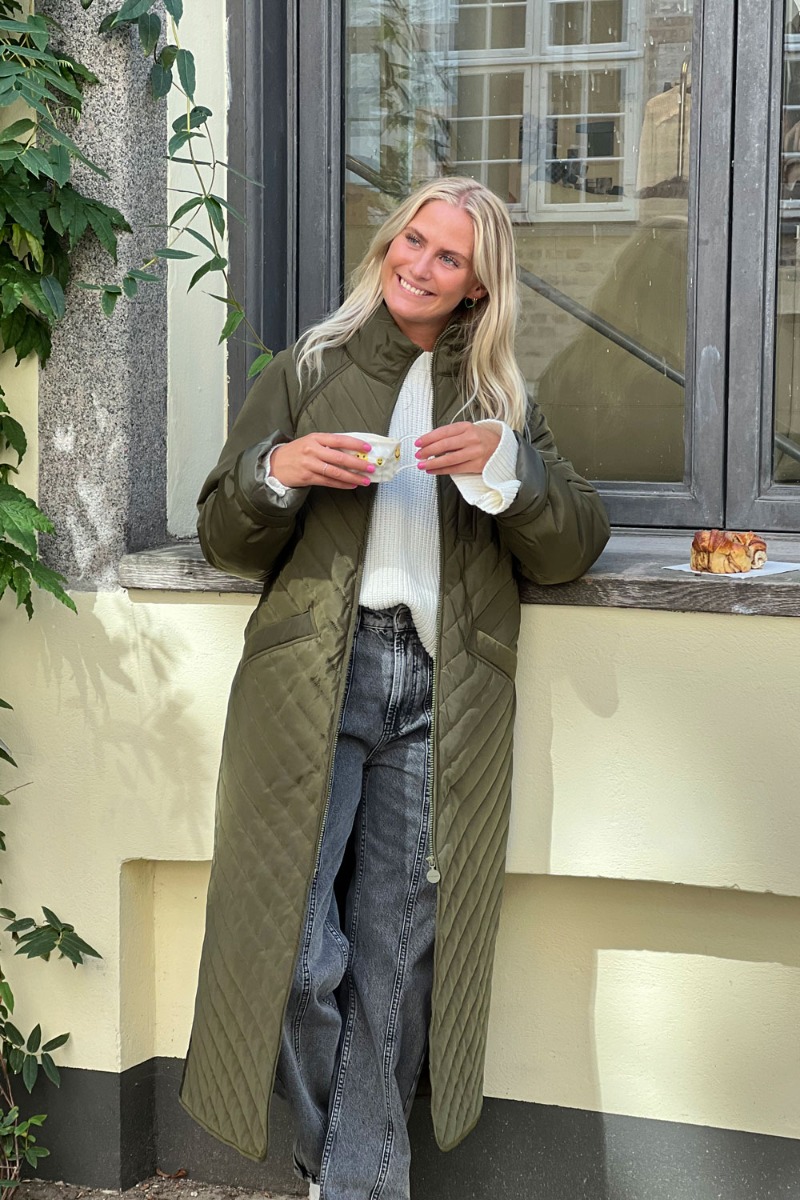 En skøn jakke fra Global Funk i army grøn farve. Jakken er i quiltet materiale som går i et fint mønster skråt nedad. Jakke lynes foran med en lynlås der skjult og som går helt op i en høj hals. Lommerne er dybe og som en lille detalje så er der en brystlomme i den ene side. Jakken findes også i sort.