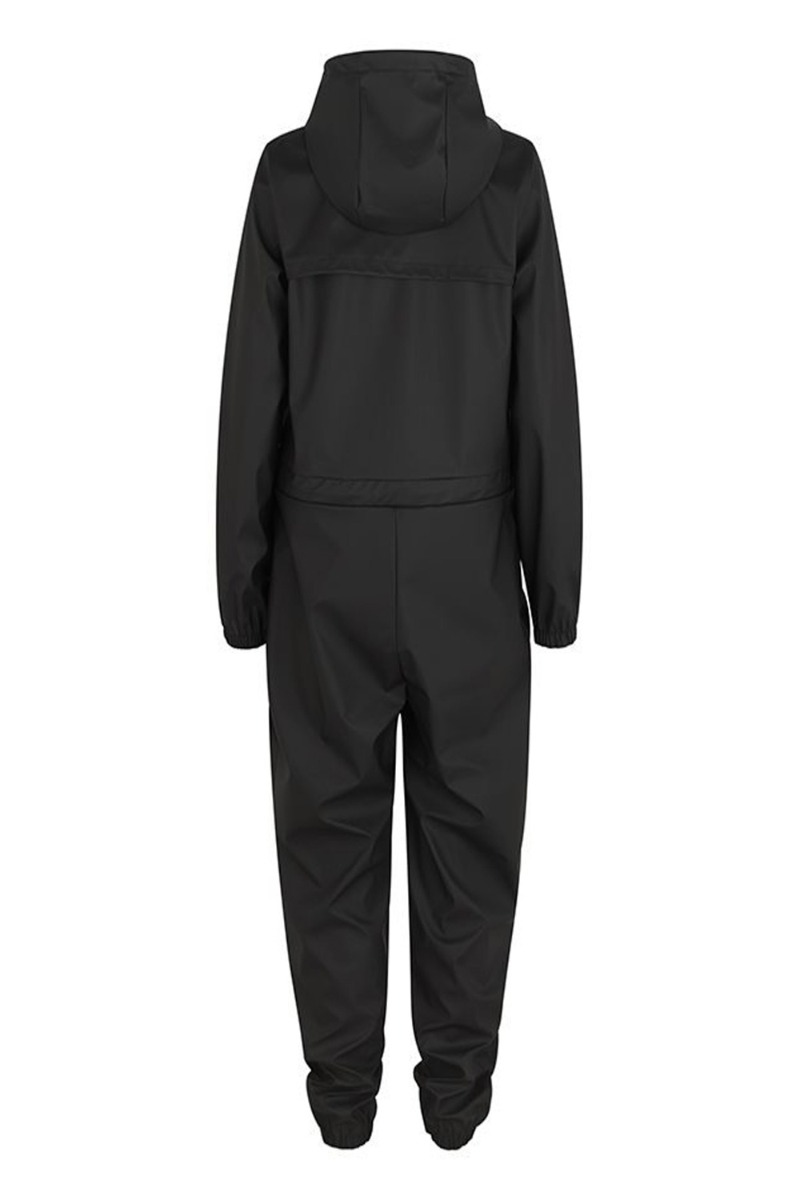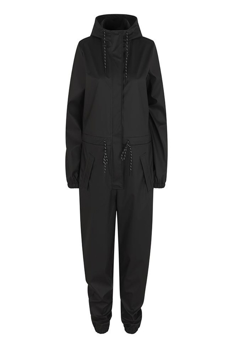 Sort jumpsuit fra Global Funk. Jumpsuiten snøres ind i taljen der giver en god pasform med elastik nede ved anklen og ved håndleddet. Jumpsuiten er regntæt, vindtæt og åndbar. Den lukkes foran med en vandtæt lynlås og knaplukning. Jumpsuiten har hætte og er et MUST året rundt til det danske vejr!