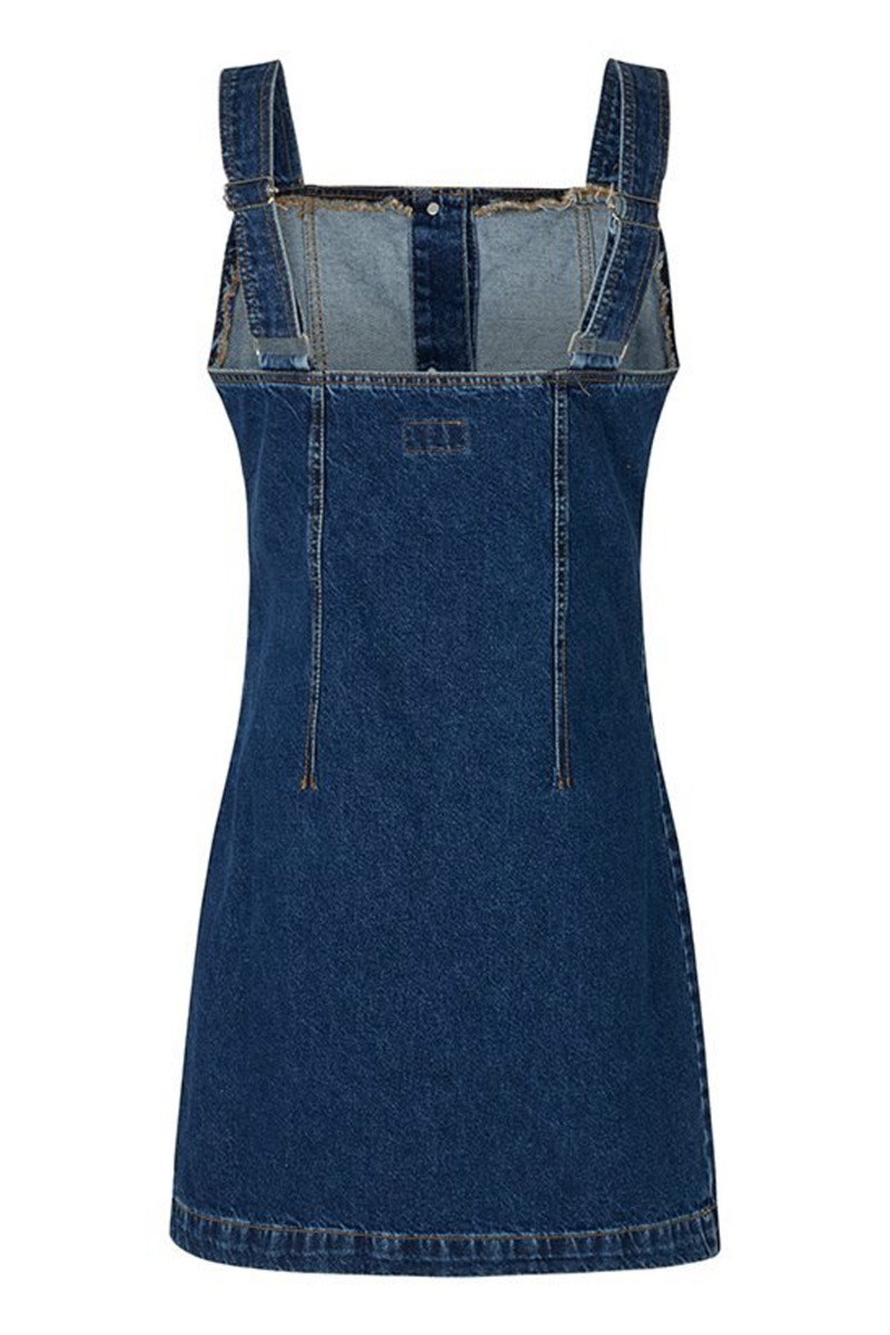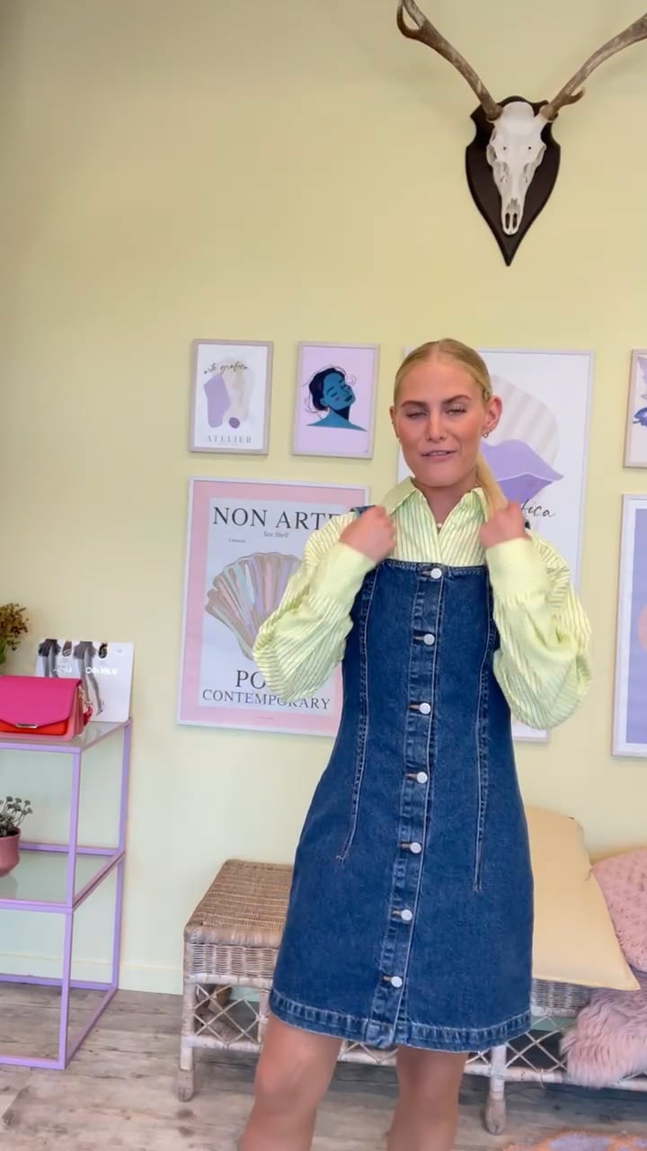 Sej denim kjole fra Global Funk. Spenceren lukkes foran med knapper hele vejen ned og har brede justerbare stropper. Den er lettere tætsiddende og super cool at bruge med en t-shirt, skjorte eller strik alt efter dit humør.