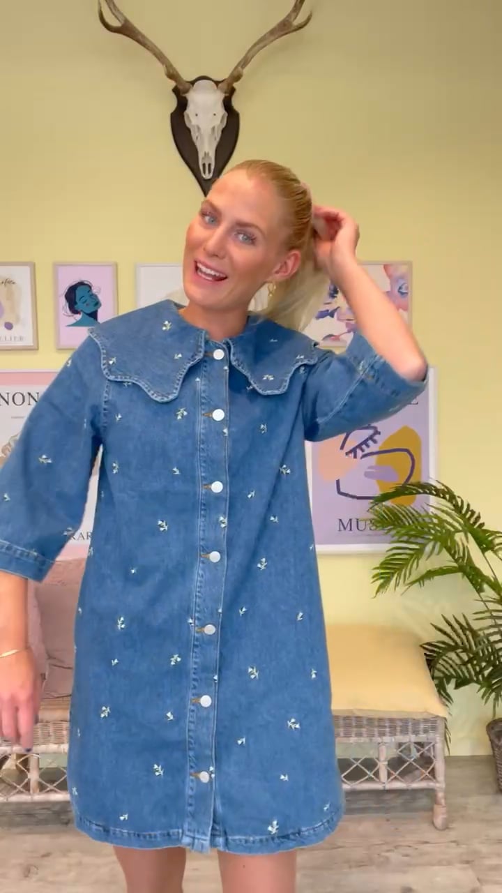 Sejeste og smukkeste denimkjole fra Global Funk. Kjolen har den fineste detalje med små broderi blomster og den store bølgede krave - disse detaljer giver et flot og feminimt udtryk på kjolen. Kjolens snit er løst og har en rummelig pasform. Ærmerne er 3/4 og helt løse. Kjolen lukkes med klassiske sølv "Global Funk" knapper. Styl kjolen alene til et par sandaler eller en lys sneakers og stylet med en langærmet basisbluse og leggings dertil.