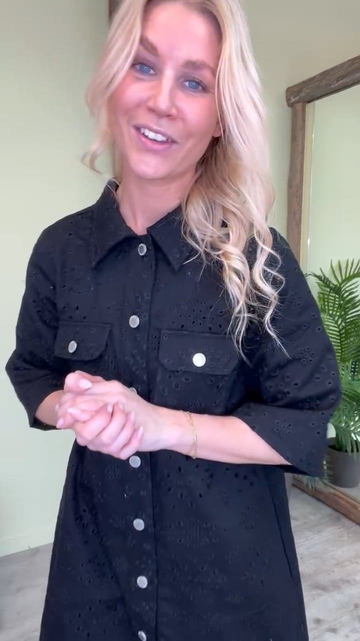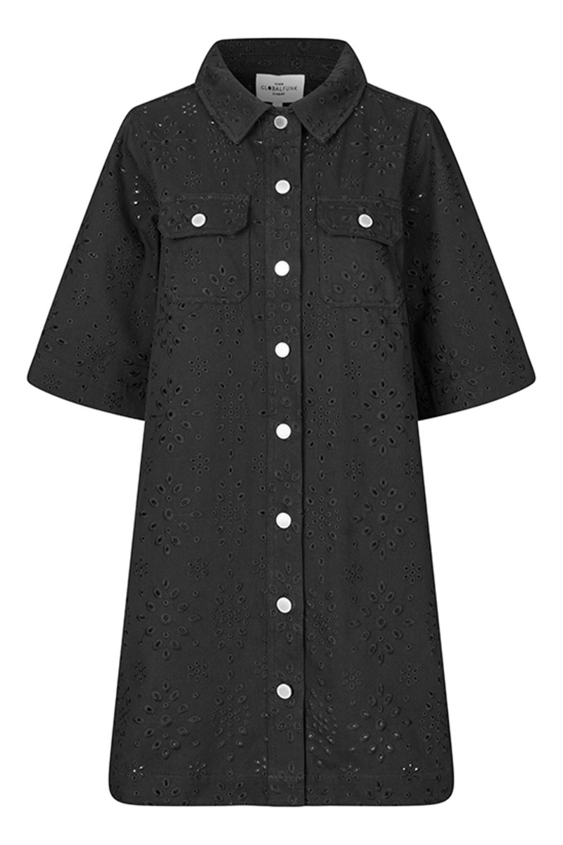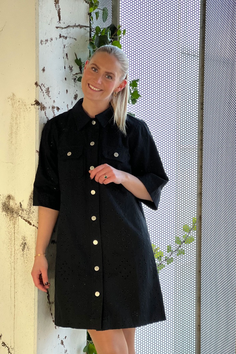 I har jo været ellevilde med denne MIRA model fra Global Funk, så vent ikke for længe hvis du har forelsket dig i denne model. Kjolen er i en klassisk pasform der har et taknemmeligt snit der klæder alle kropstyper. Den er nem at style både til hverdag, fødselsdag eller festlig anledning. Kjolen er sort med et fint lille broderet mønster og knapper foran. Style den både med strømpebukser, bare ben til de varme dage eller en buks under for at gøre den mere afslappet.