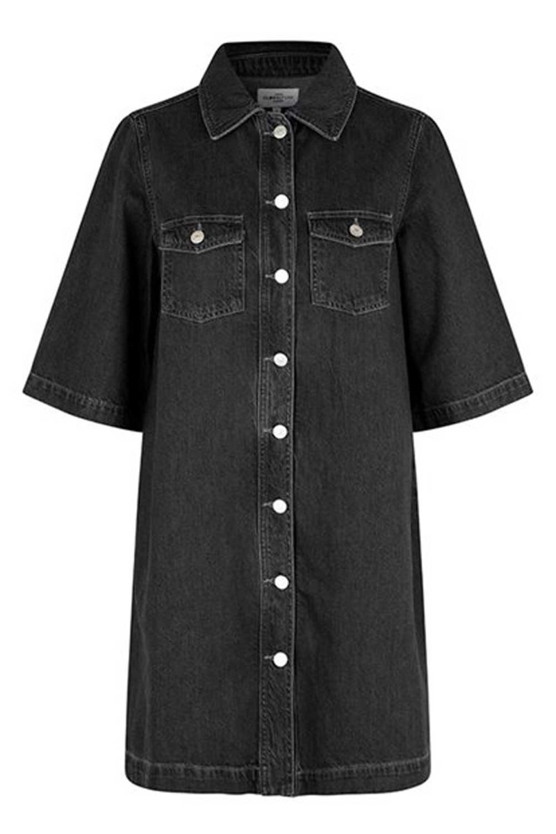 En sej denim kjole fra Global Funk i sort med sølv knapper hele vejen ned der gør den ammevenlig. Kjolen har et løst a-snit med korte t-shirtærmer der gør den anvendelig at bruge med en langærmet bluse under.