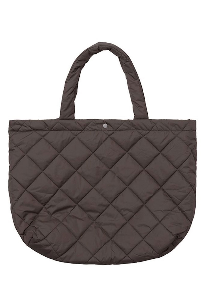 Brun let quiltet taske fra Global Funk. Tasken er god rummelig med plads til ALT! Den har en enkelt knap i midten og to stropper.