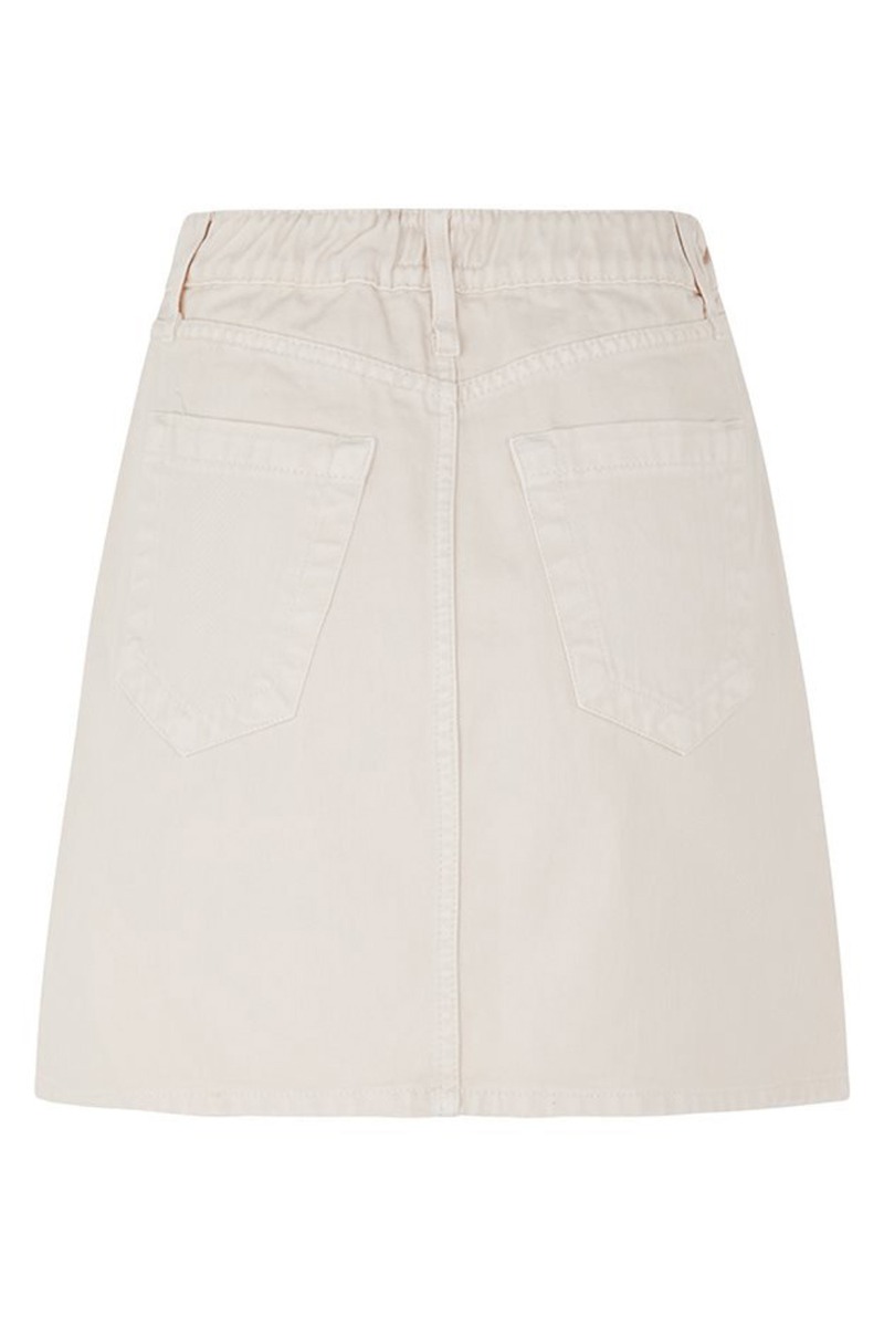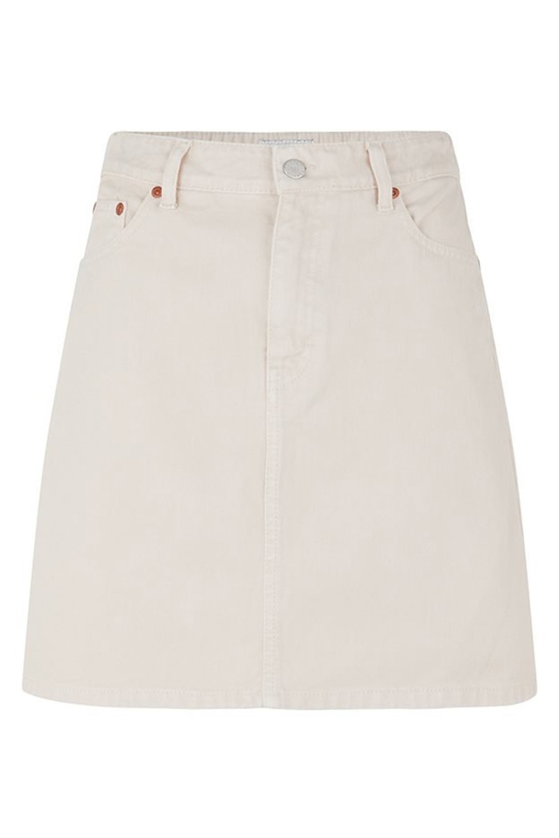 Kort denim nederdel fra Global Funk i beige. Nederdelen har et lille a-snit med elastik bagtil og fast linning foran der lukkes med knaplukning. Style den til hverdag med en t-shirt eller skjorte.