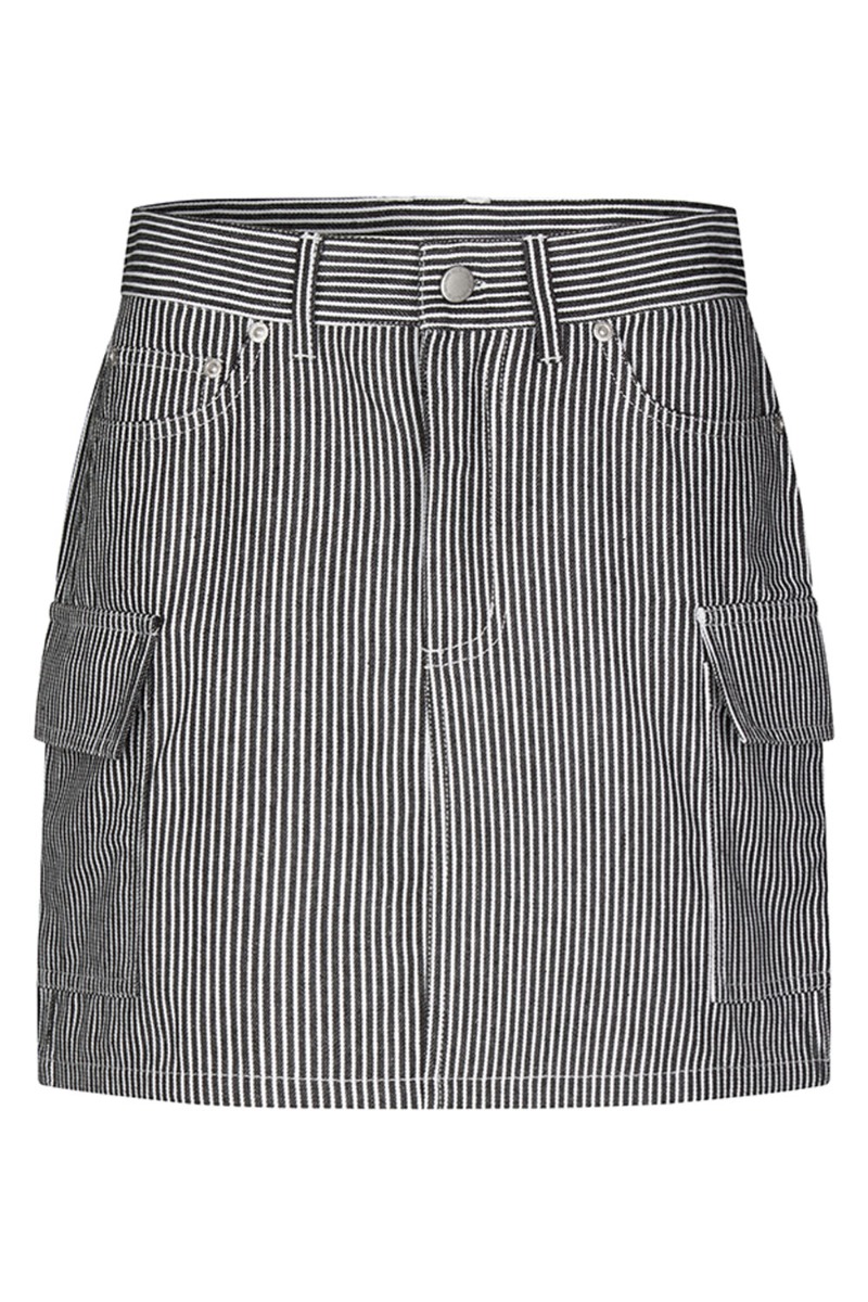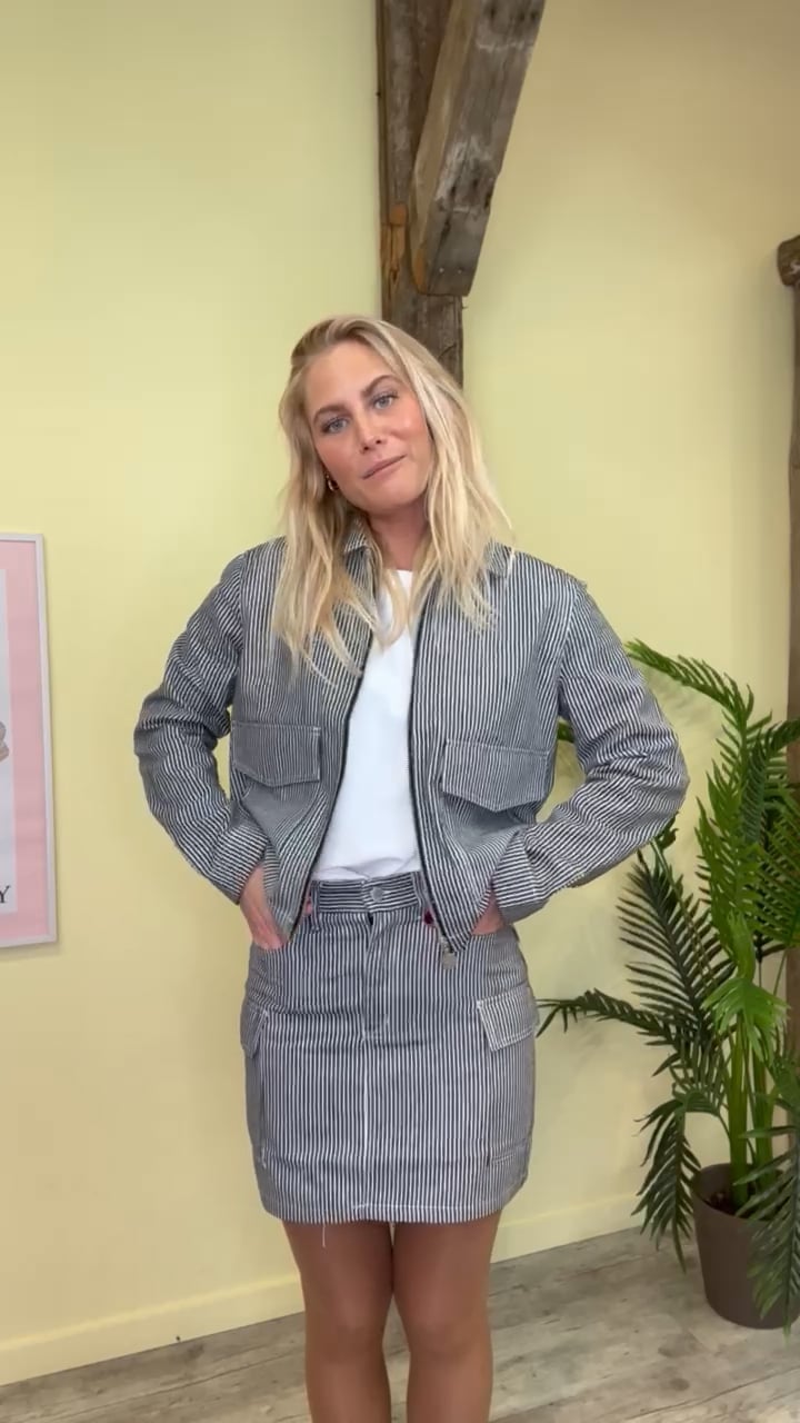 En fin nederdel til denne sæson fra Global Funk med striber i hvid og navy. Den har sidelommer så den får dette rå cargo look. Derudover er der bæltestropper i taljen og den lukkes foran med både knap og lynlås. Der en matchende jakke til, så du nemt kan laver et sæt.