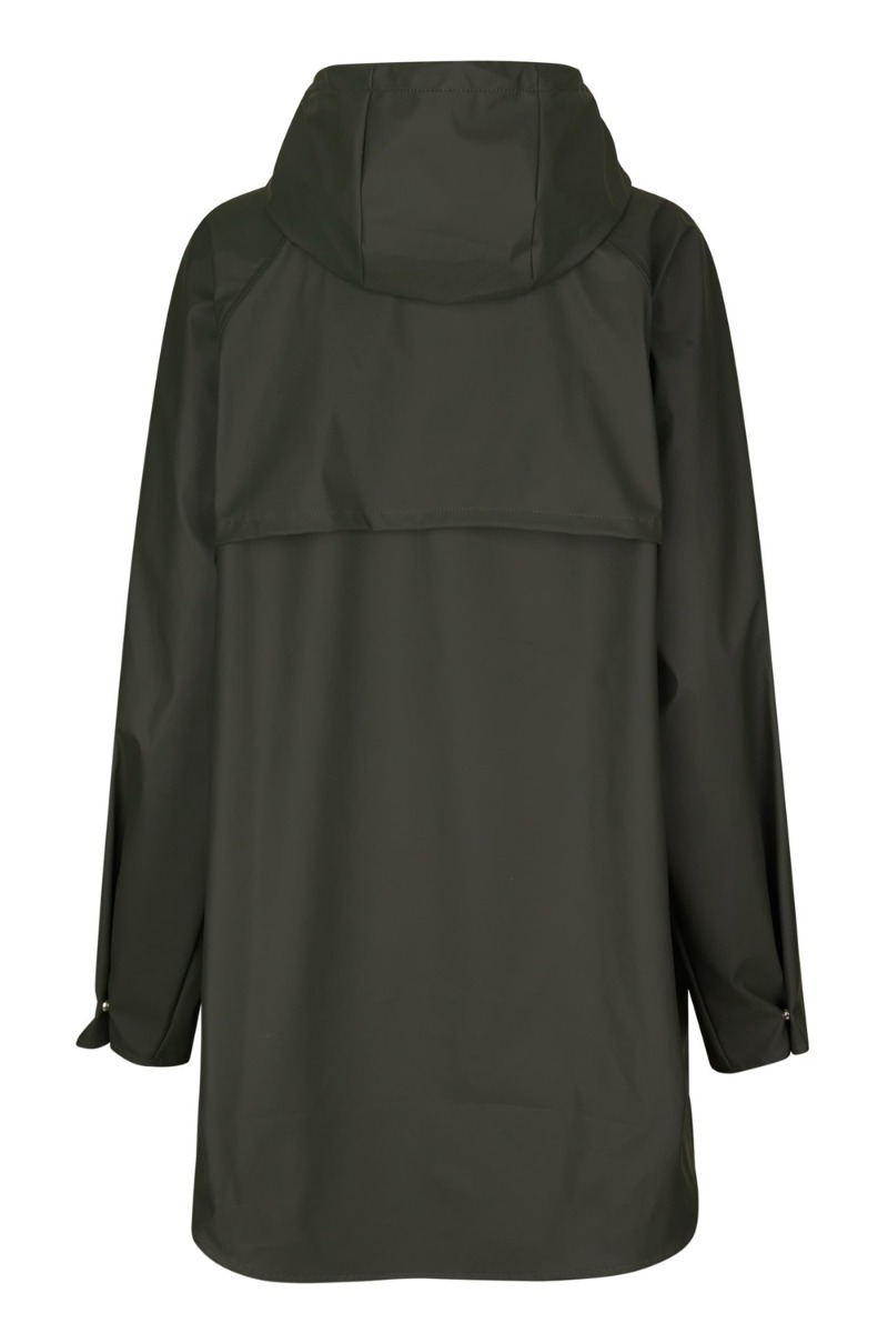 Army regnjakke fra Global Funk i en rummelig pasform med hætte og snøre der kan justeres. Foran har regnjakken en kort lynlås med en stor lomme der giver en cool afslappet detalje. Regnjakken har en mellem længde og findes i sort og beige.