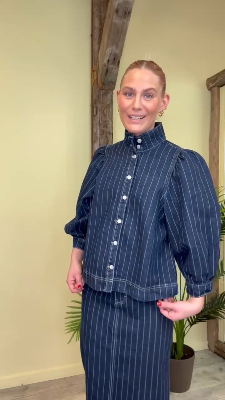 Cool denimskjorte fra Global Funk med super pasform, ballon-snit ved ærmerne og en lille t-neck. Skjorten lukkes foran med gennemgående knapper og er lavet i et blødt denimlook med gennemfående hvide striber, der giver et cool udtryk. Skjorten/Jakken går lige til buksekanten, hvilket gør det cool at style den med en højtaljet jeans eller nederdelen i samme design.