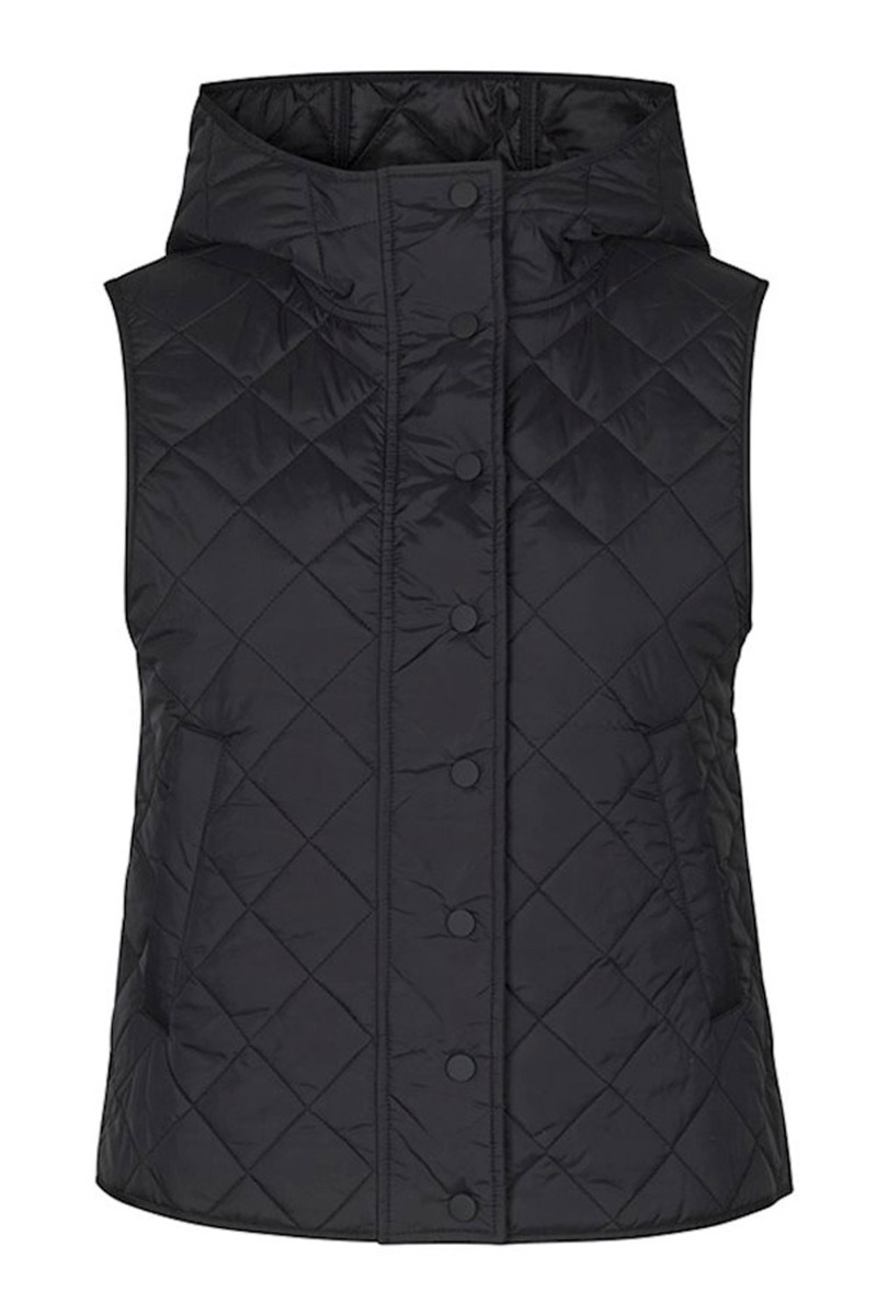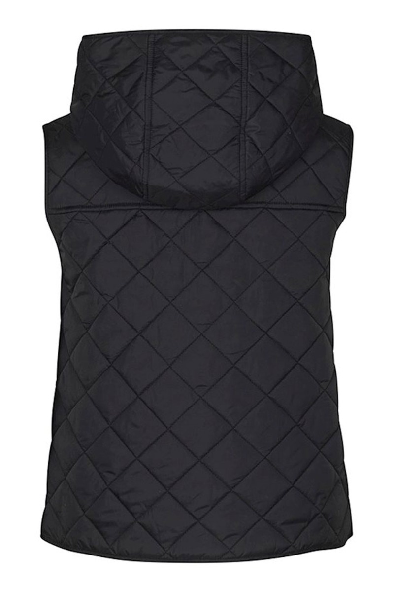 Kort sort quiltvest fra Global Funk. Vesten er lavet i en let kvalitet med fastsiddende hætte der lukkes foran med sorte trykknapper. Den er super fin at style som en lille overgangsjakke med en strik under.
