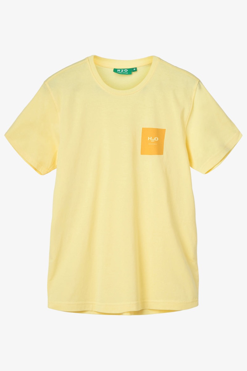 En absolut favorit T-shirt her hos os er Lyø fra H2O. Her i en smuk sommergul med et firkantet printet logo i venstre side. T-shirten har en klassisk rund halsudskæring og en løstsiddende pasform.