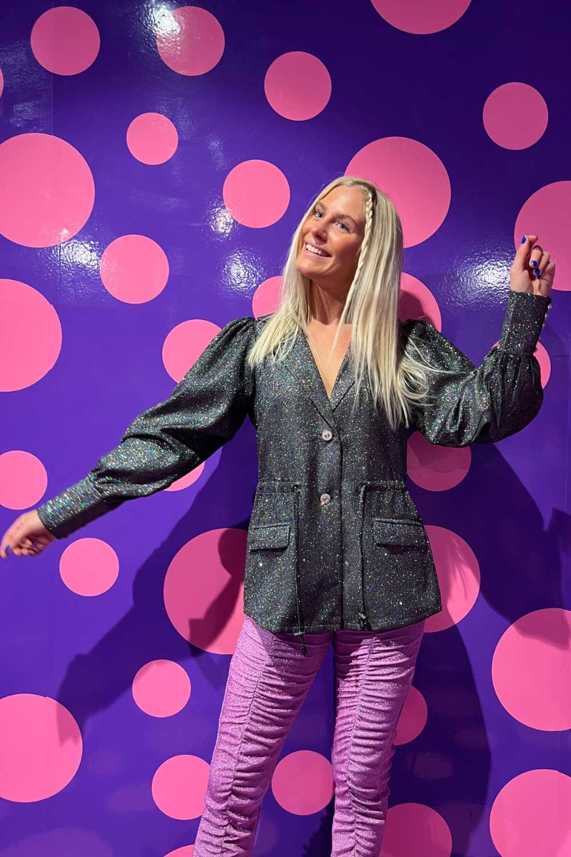 WAAAU, den nye smukke blazer fra Hunkøn er helt utrolig smuk! Her kommer du virkelig til at shine på dansegulvet til de mange fester. Blazeren har et rummelig snit med pufærmer, snøre i livet og de fineste perlemorsknapper foran. Blazeren har en mørk bundfarve med det flotteste multifarvet glimmer. Style den til et par pæne bukser eller rå jeans alt efter anledning.