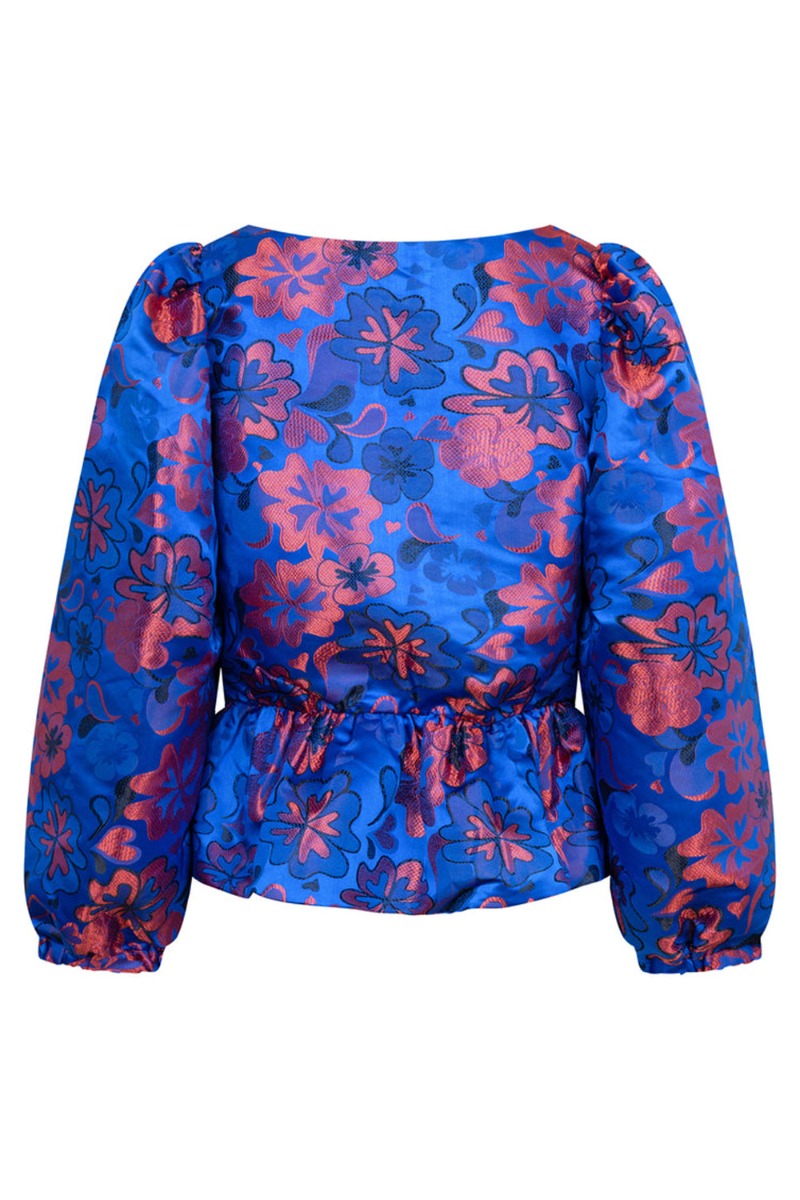 Den smukkeste bluse fra Hunkøn er landet i et flot print i blå og rød. Kvaliteten har en smule shine i sig og giver et flot feminint udtryk. Blusen er med peplum i bunden og med ballonærmer der afsluttes med en elastikkant. Derudover er der en skjult lynlås i siden så den er til at komme i. Der findes et par matchende bukser.