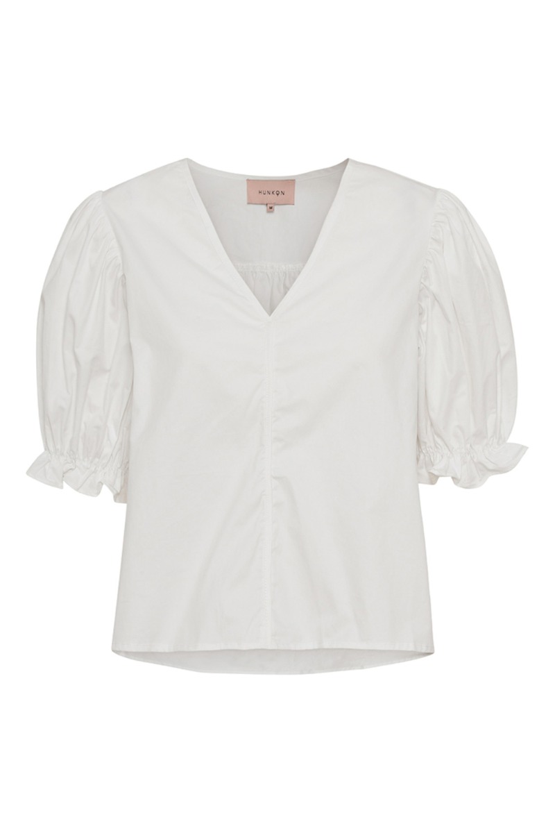 Enkel men utrolig feminin bluse fra Hunkøn der er et musthave til sommerens solrige dage. Blusen er designet med et lille a-snit og ballonærmer der afsluttes med elastikkant og flæsedetalje. Foran går den ned i v-udskæring med en lille detalje langs fronten. Denne bluse er anvendelig til alle anledninger efter vores mening!