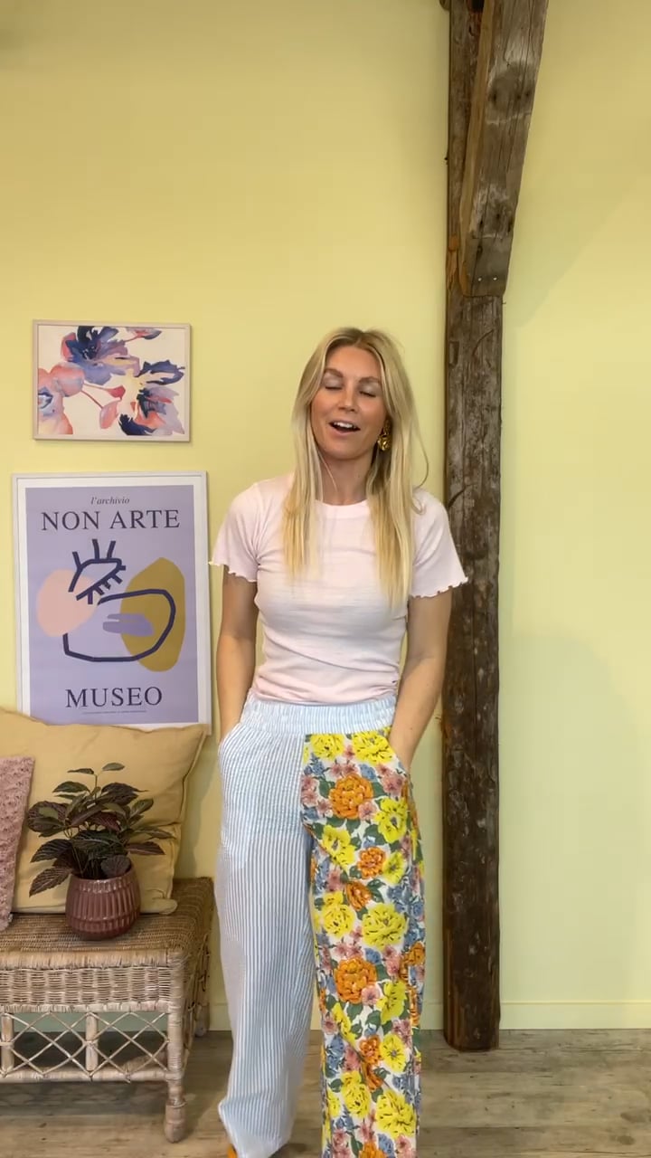 Hunkøn har designet de sejeste sommerbukser i to-delt-print hvor den ene side er med blomsterprint og anden med striber der giver en rigtig sød effekt. Bukserne er lige i pasformen i et let og luftigt materiale med elastik i taljen og to strålommer foran. Style med en tee, skjorte eller den matchende